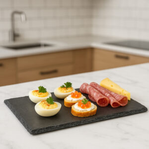 Platou de servire Atmosphera realizat din ardezie naturala, cu design elegant si modern, potrivit pentru aperitive, feluri principale sau deserturi. Materialul natural ii confera un aspect sofisticat si autentic.