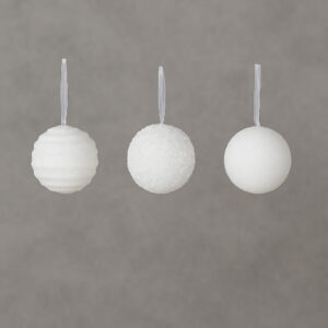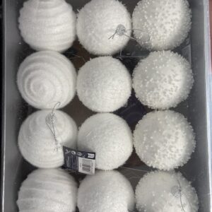 Set 12 globuri Craciun cu sclipici, 3 modele diferite, polistiren, diametru 8 cm, alb