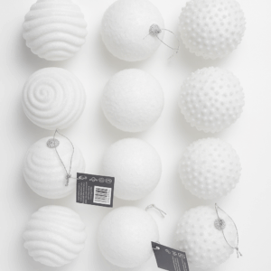 Set 12 globuri Craciun cu sclipici, 3 modele diferite, polistiren, diametru 8 cm, alb Set 12 globuri Craciun cu sclipici, 3 modele diferite, polistiren, diametru 8 cm, alb