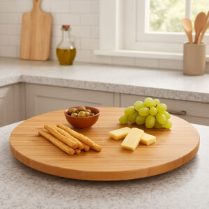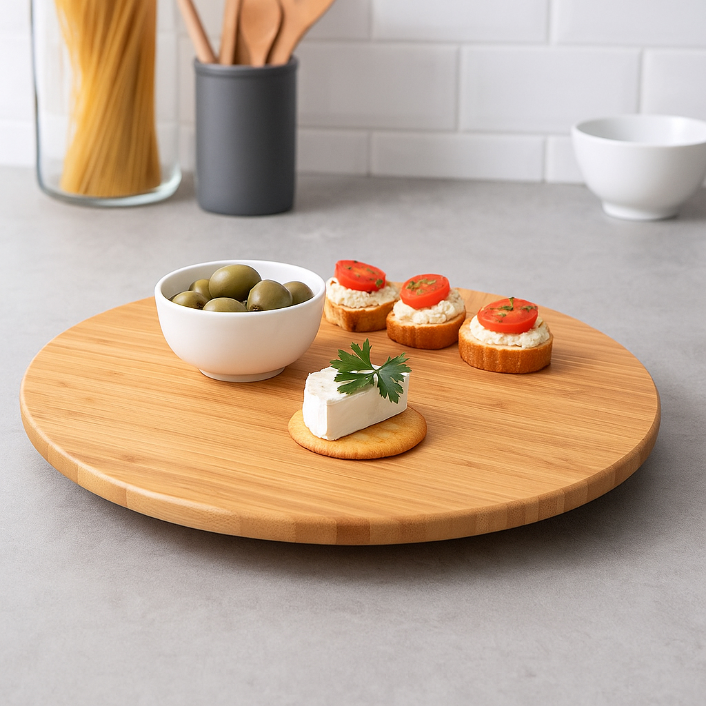 Platoul rotativ 5Five din bambus, cu diametru de 50 cm, este alegerea ideala pentru servirea eleganta a preparatelor. Functional si solid, permite acces usor la alimente pentru toti invitatii, adaugand in acelasi timp un aspect natural si modern decorului mesei.