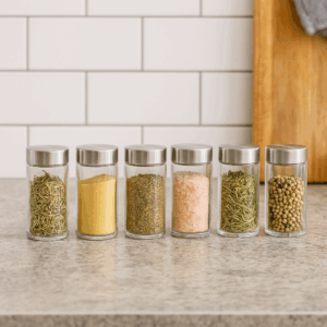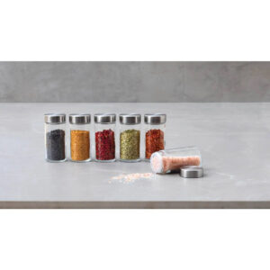 Set practic de 6 borcane 5Five pentru condimente, realizate din sticla transparenta cu capac din inox si sistem de presarare. Ideale pentru depozitarea organizata a condimentelor preferate si pentru un aspect modern in bucatarie.