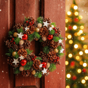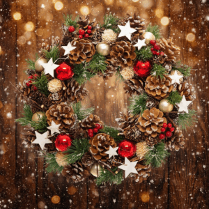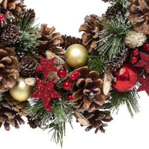Coronita decorativa este un accesoriu ideal pentru decorul de sarbatori. Cu un design plin de farmec, combinand frunze verzi, stelute aurii si conuri de pin, aduce o nota naturala si eleganta atat pe usa de la intrare, cat si in interiorul casei.