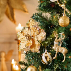 Floare decorativa poinsettia aurie, realizata din poliester si otel, ideala pentru decoratiuni de Craciun. Poate fi integrata in aranjamente festive, coronite sau brazi, adaugand o nota de stralucire eleganta.