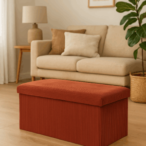 Taburetul dublu pliabil Arum de la Atmosphera adauga caldura si rafinament oricarui interior. Realizat din material tip catifea cu dungi, in nuanta ambra, combina eleganta cu functionalitatea, oferind un loc confortabil pentru sezut si un spatiu generos pentru depozitare.