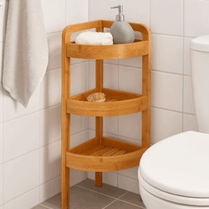 Etajera de colt Bambou este o solutie eleganta si practica pentru depozitare in spatii mici. Fabricata din bambus natural, aduce o nota calda si moderna oricarei incaperi, fie ca este folosita in baie, bucatarie sau living.