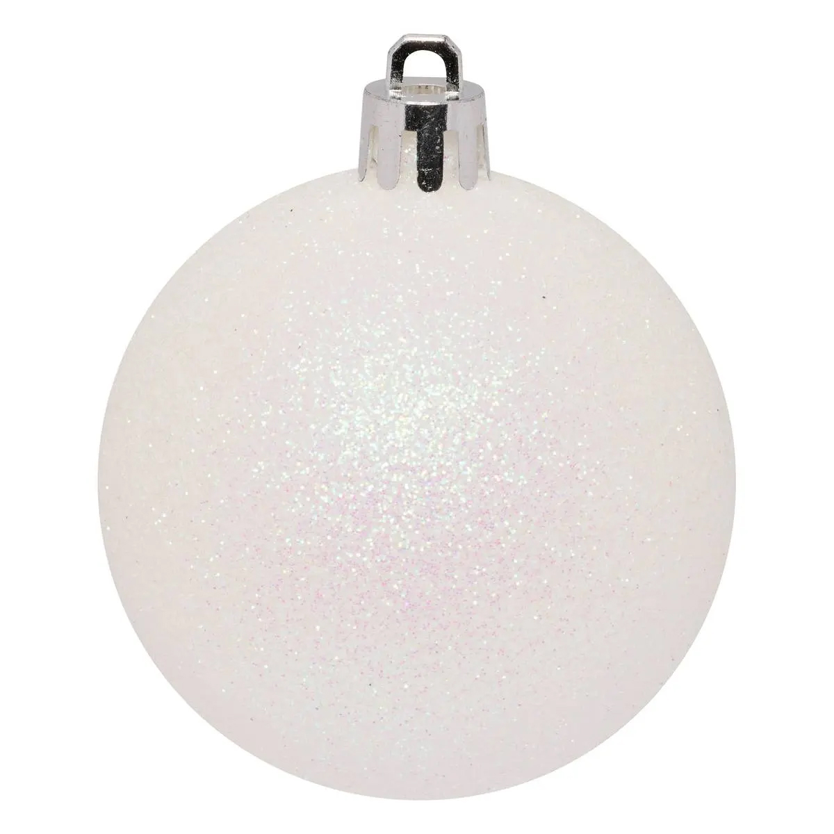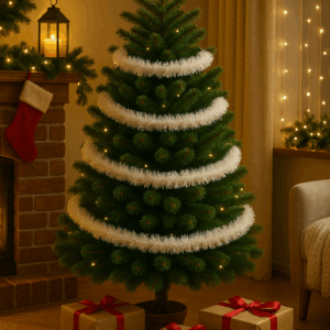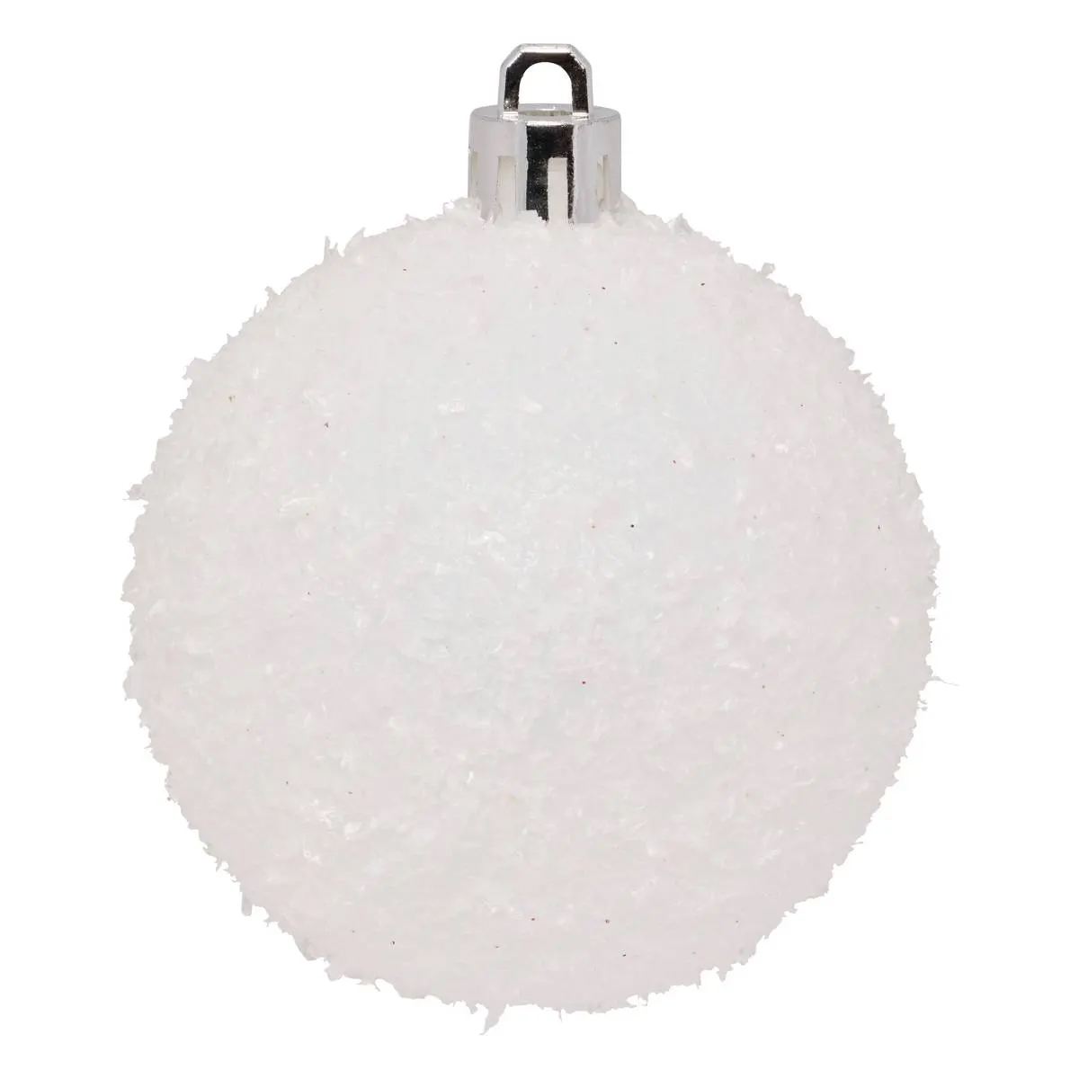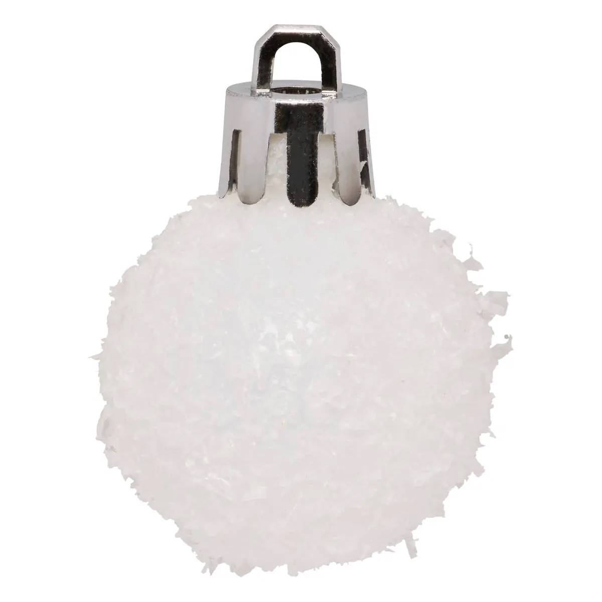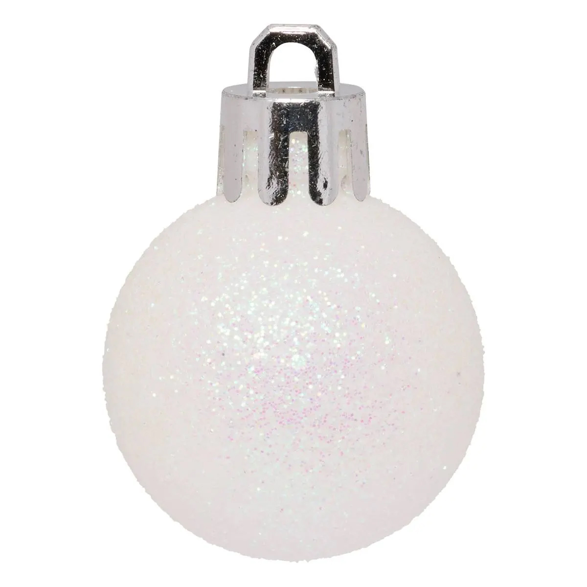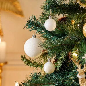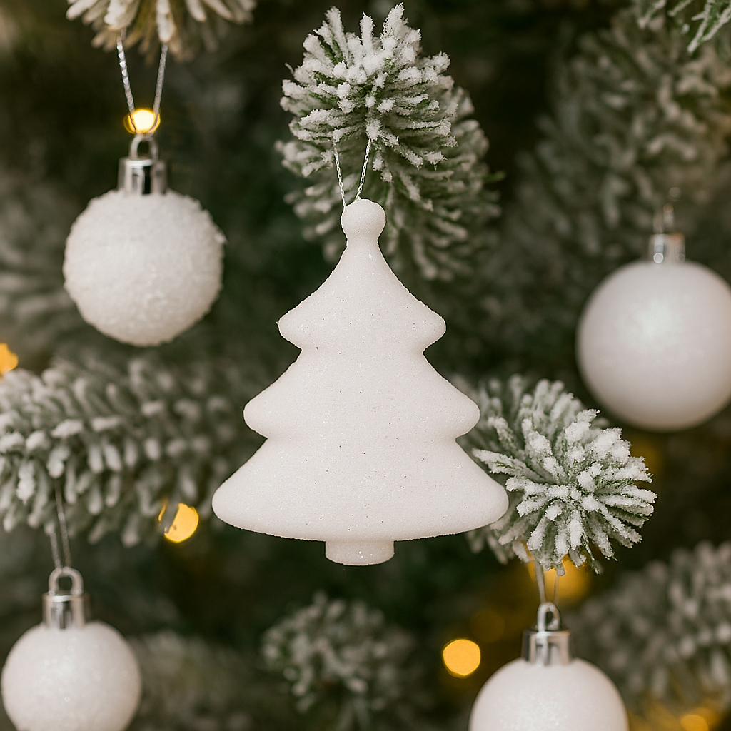 Set complet de decoratiuni albe pentru bradul de Craciun, conceput pentru a aduce un aspect elegant si luminos in locuinta. Include globuri in doua dimensiuni, o ghirlanda, un varf de brad si mini brazi decorativi. Ideal pentru un decor de sarbatoare armonios si rafinat.