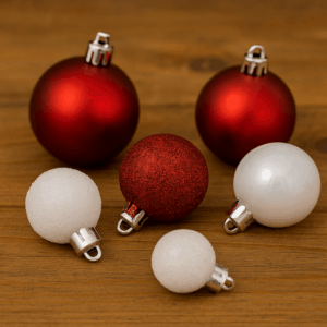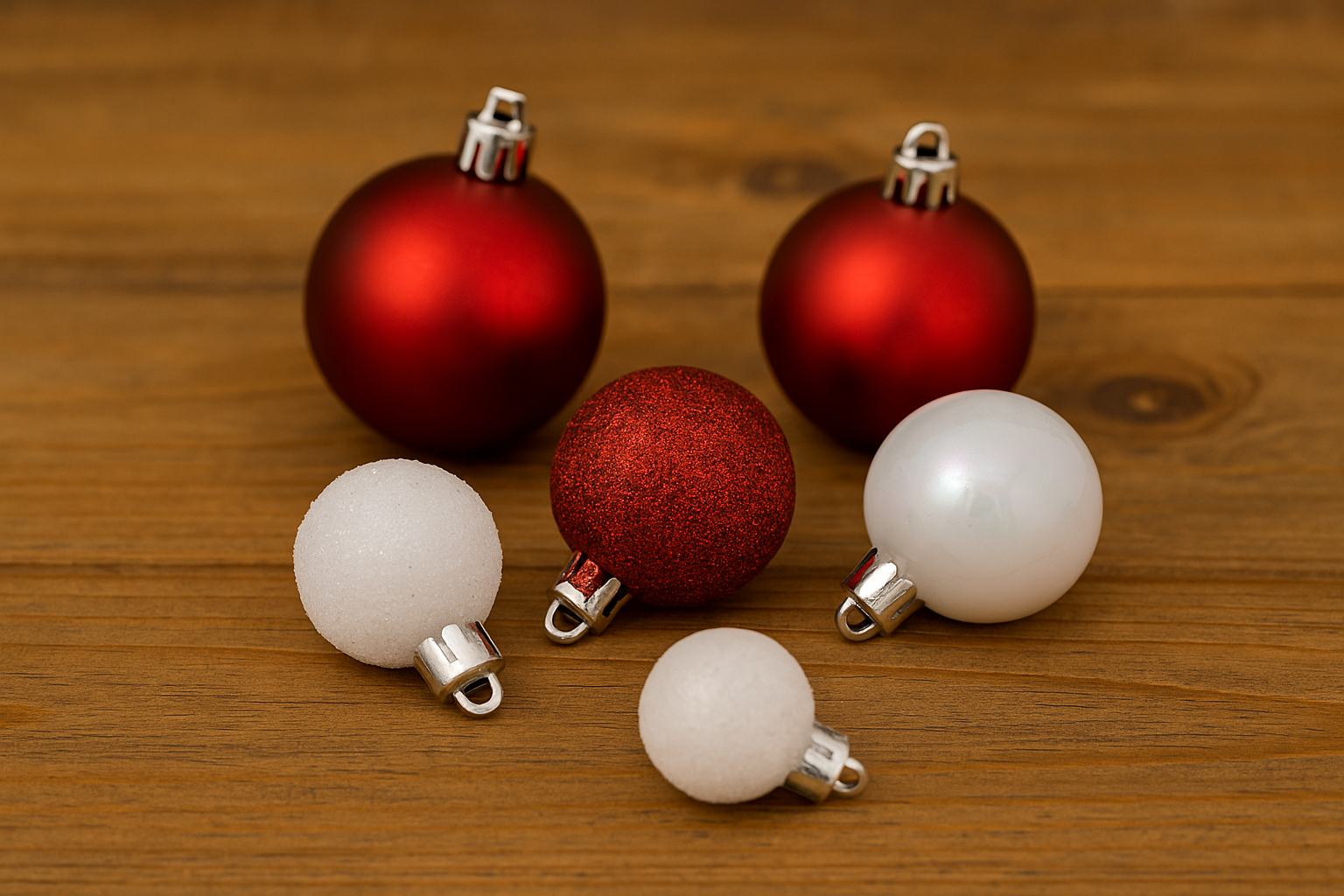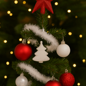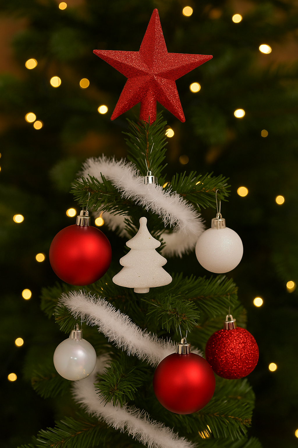 Set complet de decoratiuni pentru bradul de Craciun in nuante clasice de rosu si alb. Include globuri in doua dimensiuni, ghirlanda stralucitoare, varf de brad elegant si figurine suspendate, pentru un aspect festiv echilibrat si rafinat. Perfect pentru a crea o atmosfera calda si traditionala in timpul sarbatorilor.