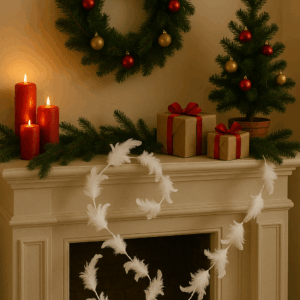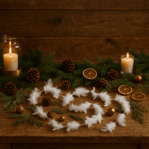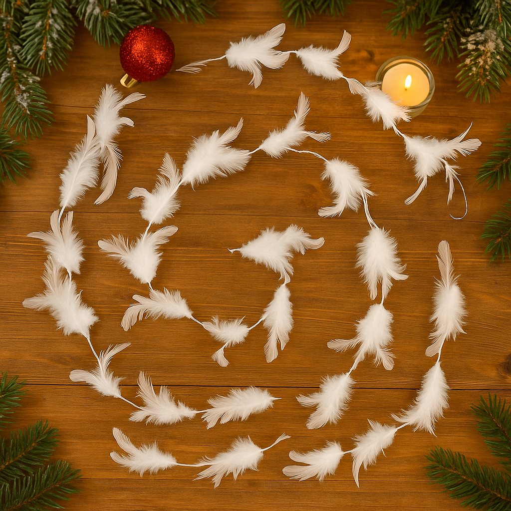 Boa decorativa alba din pene sintetice, lunga de 2 metri, ideala pentru decorarea meselor, bradului de Craciun, vitrinelor sau aranjamentelor festive. Aduce o nota eleganta si rafinata oricarui decor de iarna.