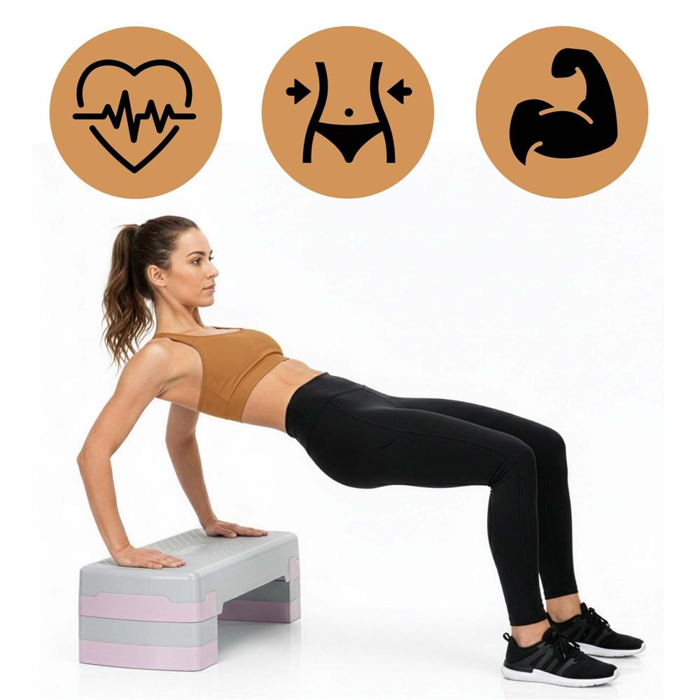 Podest aerobic reglabil, conceput pentru antrenamente de fitness si aerobic acasa sau la sala. Structura solida permite ajustarea inaltimii in functie de nivelul de dificultate dorit, oferind stabilitate si siguranta in utilizare.
