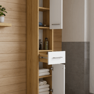 Dulapul FIN in nuanta stejar artisan aduce un plus de caldura si eleganta baii tale. Functional si modern, include doua usi, un sertar si rafturi interioare ce ofera spatiu amplu pentru organizarea produselor de ingrijire, prosoapelor sau accesoriilor. Construit din PAL laminat rezistent la umiditate, este ideal atat pentru montaj suspendat, cat si pentru amplasare pe podea.