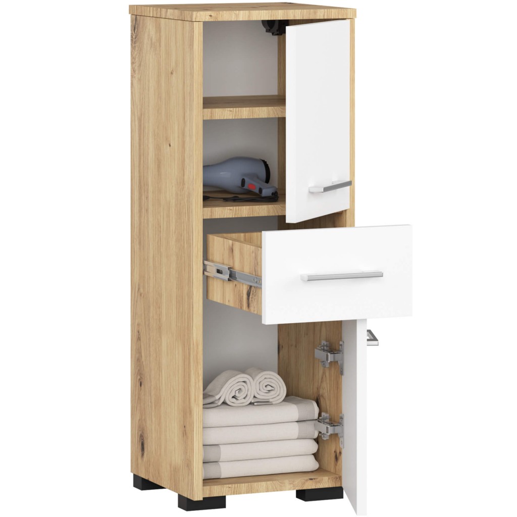 Dulap de baie tip baza, cu 2 usi si sertar, PAL 16 mm, 30x30x85 cm, stejar artisan si alb Dulap de baie tip baza, cu 2 usi si sertar, PAL 16 mm, 30x30x85 cm, stejar artisan si alb