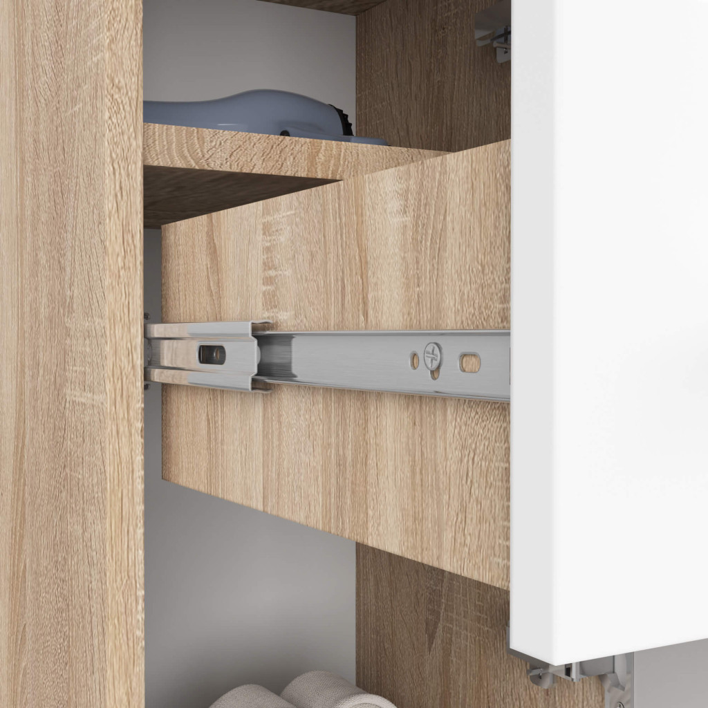 Dulapul de baie FIN este un model universal, potrivit atat pentru bai mici, cat si pentru incaperi spatioase. Designul sau compact, in finisaj stejar sonoma cu fronturi albe, aduce un aspect modern si luminos oricarui decor. Poate fi asezat langa chiuveta, cabina de dus sau masina de spalat, economisind spatiu si oferind zone de depozitare practice.