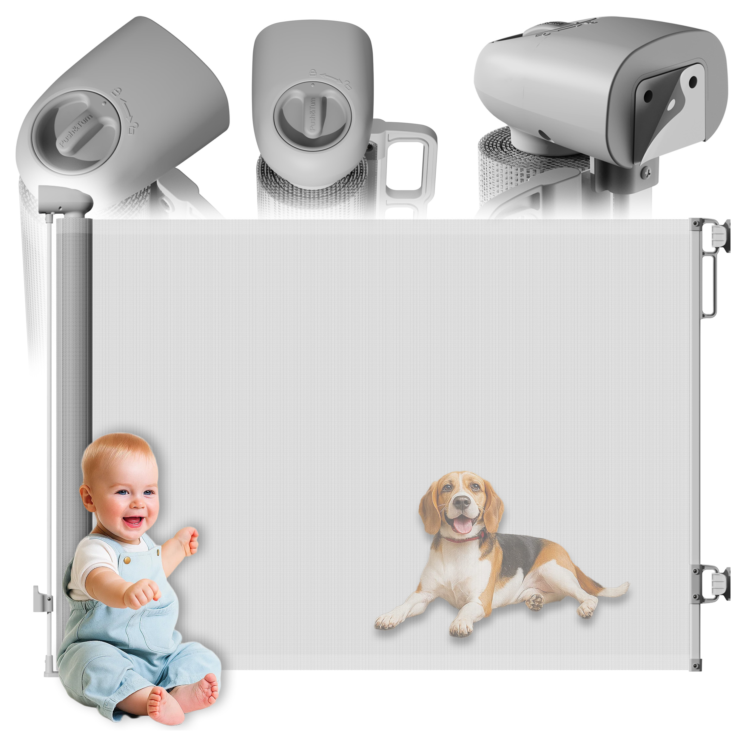Bariera de siguranta din material textil, reglabila pe inaltime si latime, potrivita pentru separarea spatiilor si protejarea copiilor.
