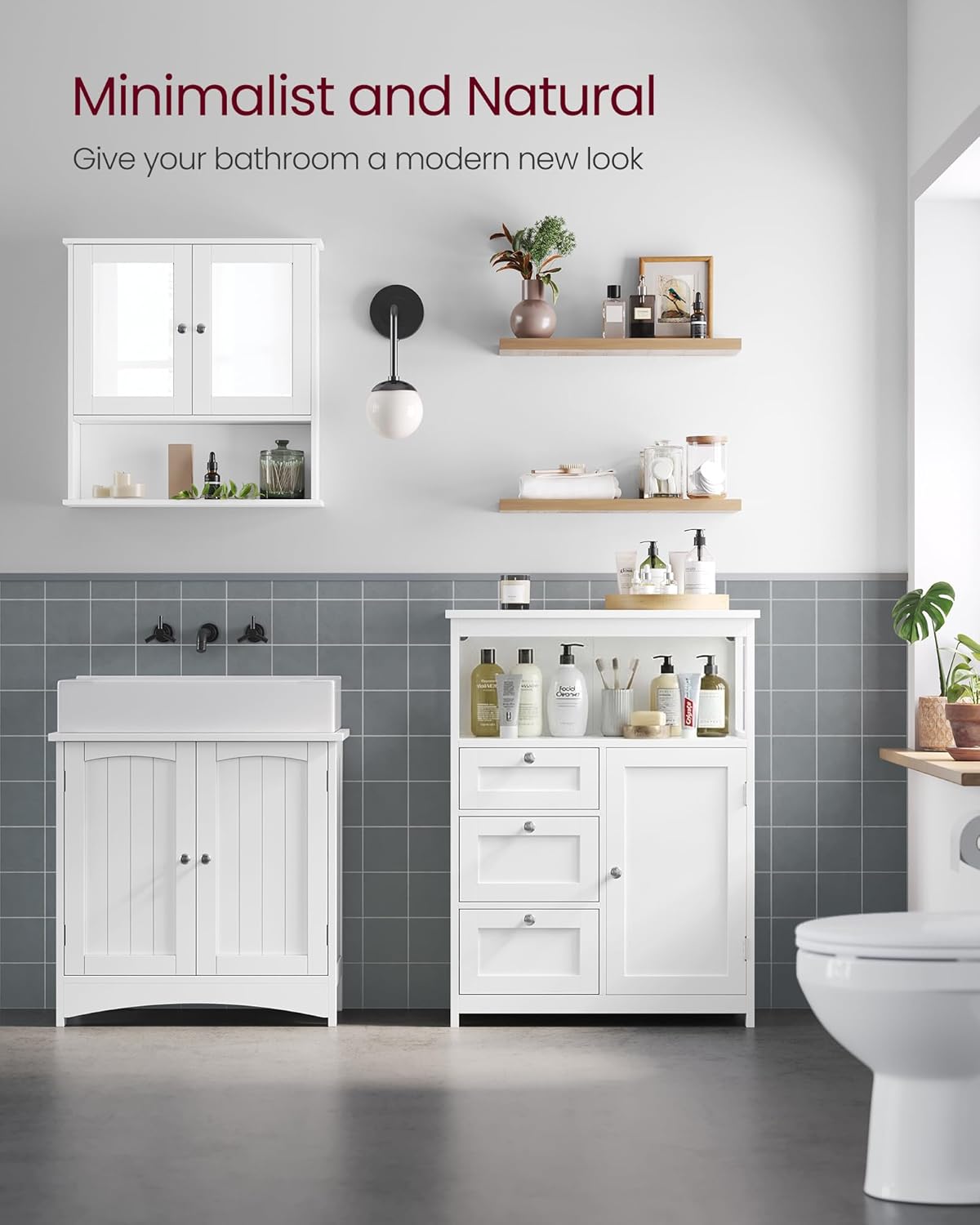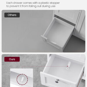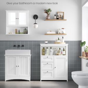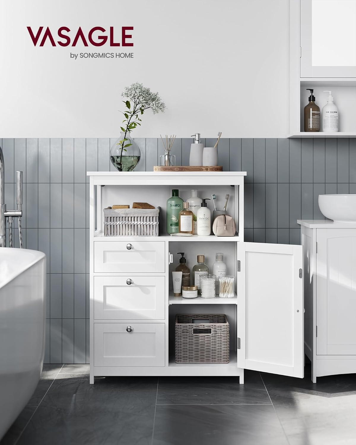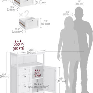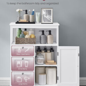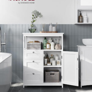 Dulapul VASAGLE este ideal pentru organizarea eficienta a baii sau altor incaperi. Dispune de compartimente variate pentru depozitare, inclusiv sertare, spatiu deschis si dulap cu raft reglabil, oferind flexibilitate pentru obiecte de diferite dimensiuni. Designul modern si compact il face potrivit pentru orice locuinta.
