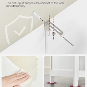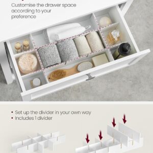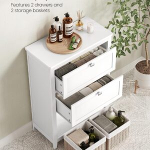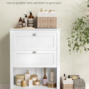 Dulapul de baie VASAGLE ofera solutii flexibile de depozitare intr-un format compact si elegant. Cele doua sertare spatioase, raftul interior si compartimentul deschis cu cosuri din ratan permit organizarea eficienta a produselor de baie. Designul alb cloud adauga un aspect luminos si aerisit incaperii.