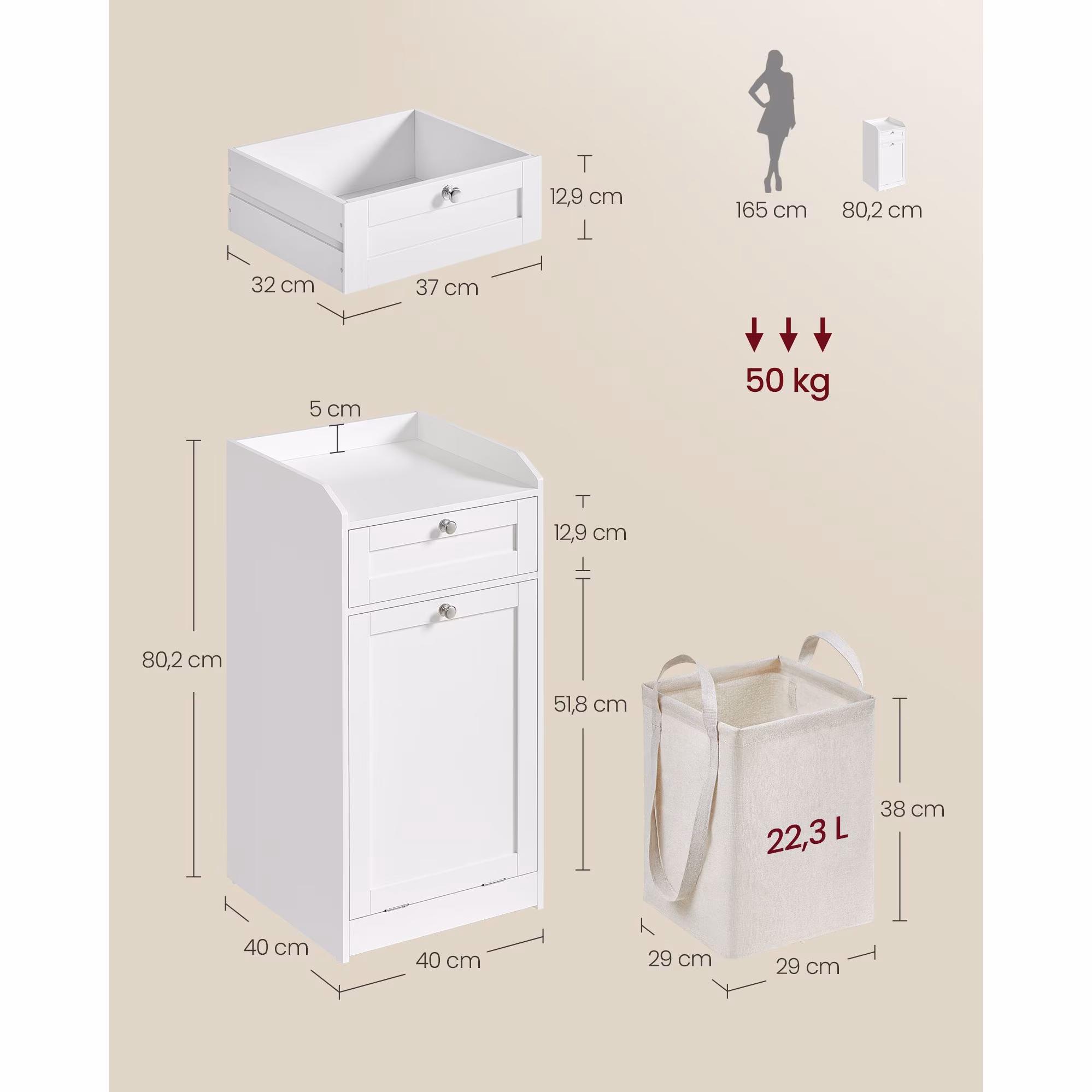 Dulap practic pentru baie, care combina functia de depozitare cu cea de cos de rufe. Blatul superior si sertarul permit acces rapid la obiectele uzuale, iar compartimentul inferior este ideal pentru depozitarea rufelor. Designul este gandit pentru utilizare zilnica, cu accent pe stabilitate, siguranta si intretinere usoara.
