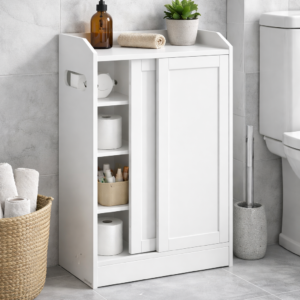 Dulapul de baie ingust VASAGLE este solutia practica pentru organizarea eficienta a spatiilor mici. Conceput special pentru a fi amplasat langa toaleta, acesta include compartimente dedicate pentru hartie igienica si peria WC, precum si rafturi reglabile pentru produse de diferite dimensiuni. Designul alb cloud completeaza armonios baile moderne.