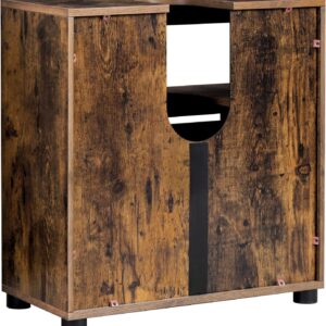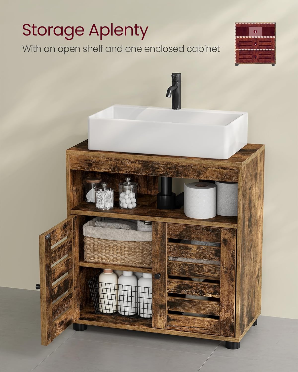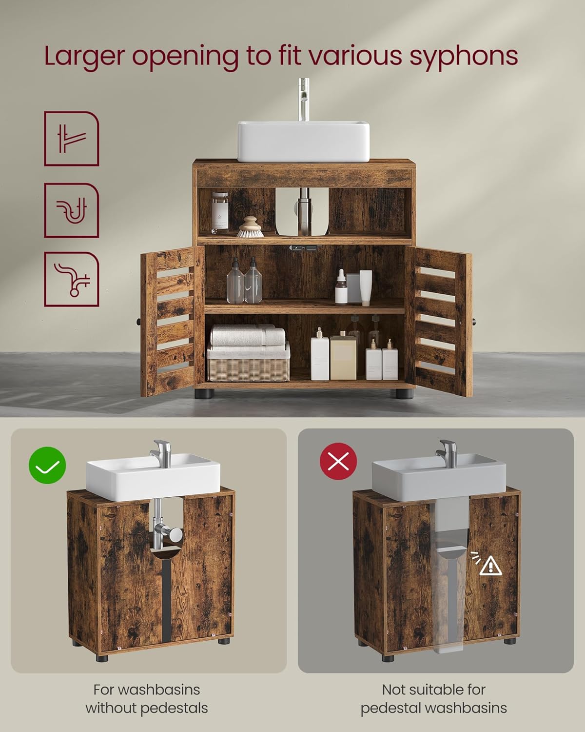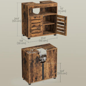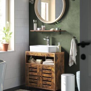 Dulapul de baie sub chiuveta VASAGLE valorifica eficient spatiul neutilizat de sub lavoar. Designul rustic adauga personalitate baii, iar compartimentarea interioara permite organizarea discreta a produselor de igiena si accesoriilor. Este potrivit pentru chiuvete fara piedestal si se integreaza usor in bai de dimensiuni mici sau medii.