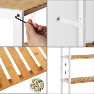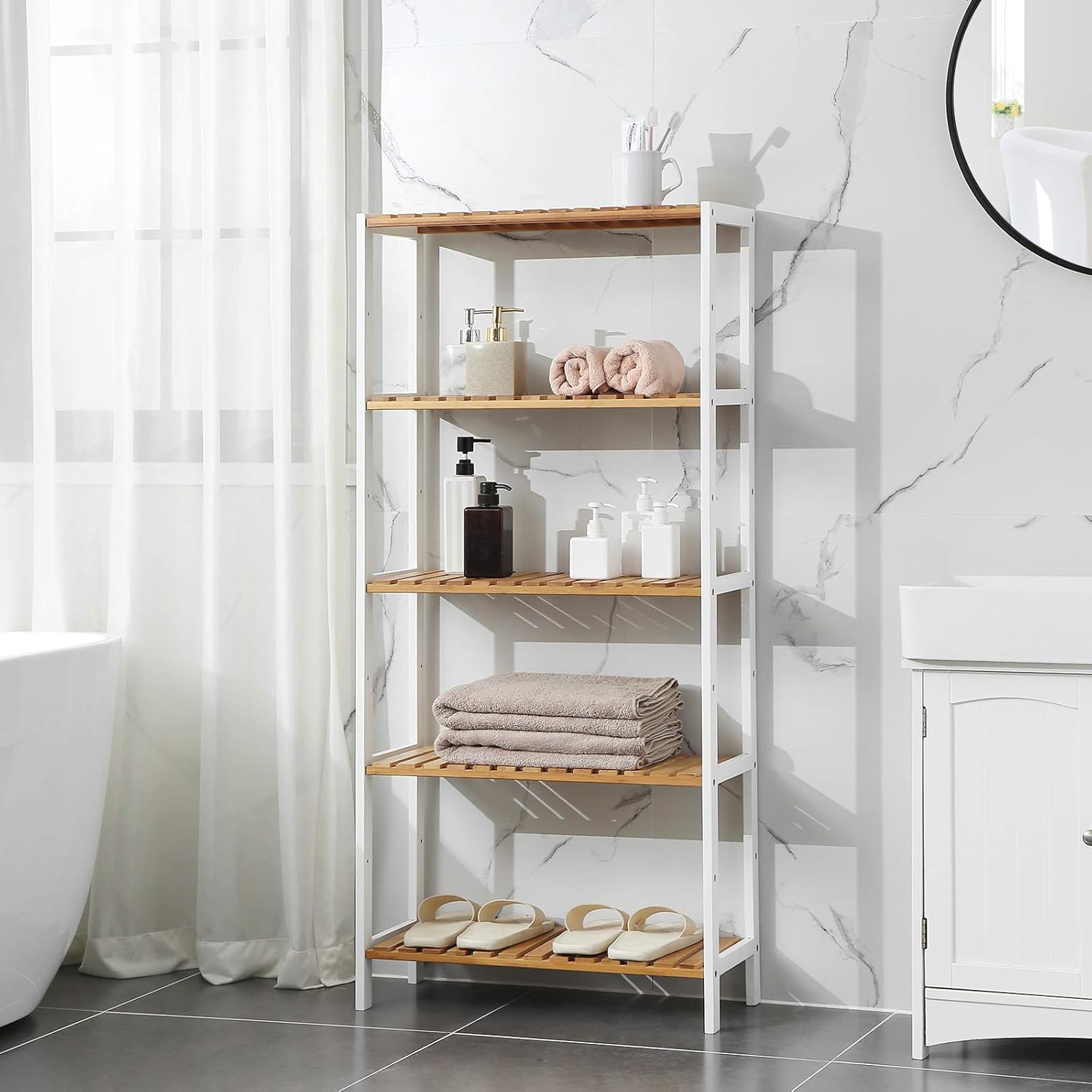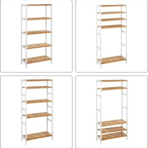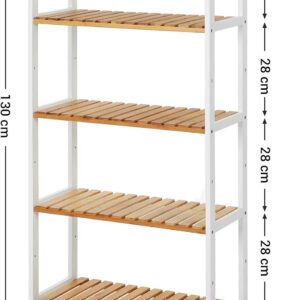 Etajera cu 5 niveluri realizata din bambus natural, conceputa pentru organizare eficienta in diverse spatii ale locuintei. Designul multifunctional permite utilizarea in baie, hol, bucatarie, living sau balcon. Rafturile ofera stabilitate ridicata si permit scurgerea apei, prevenind deformarea materialului si prelungind durata de utilizare. Structura aerisita adauga un aspect natural si ordonat incaperii.