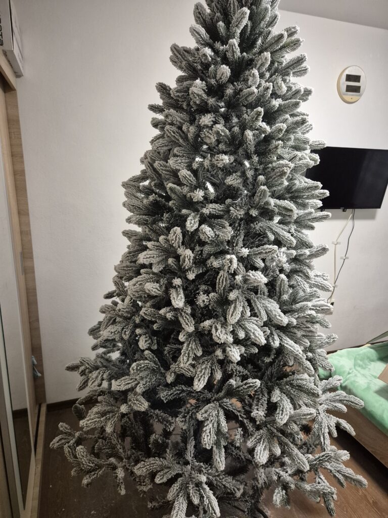 Bradul e superb,ma interesa f mult sa nu fie f lat ,si e suficient de înalt la cei 2,30 m pe care ii are înălțime.Singurul minus ar fi ca acea zăpadă de pe el cade f mult in timpul montarii bradului, însă bănuiesc ca nu va cădea continuu.