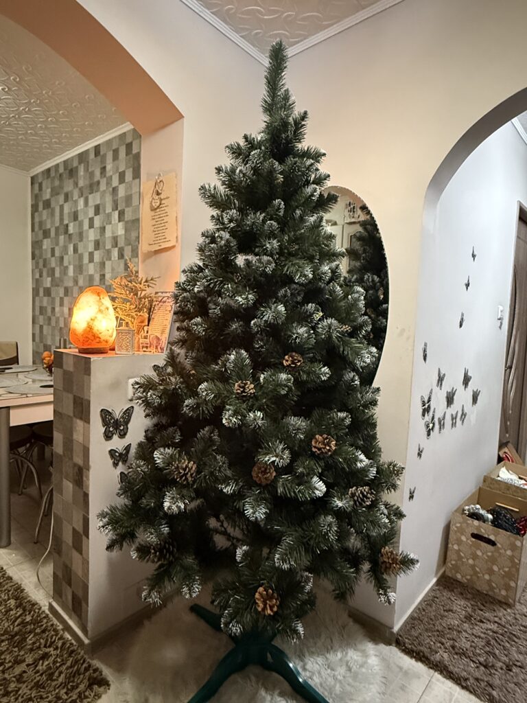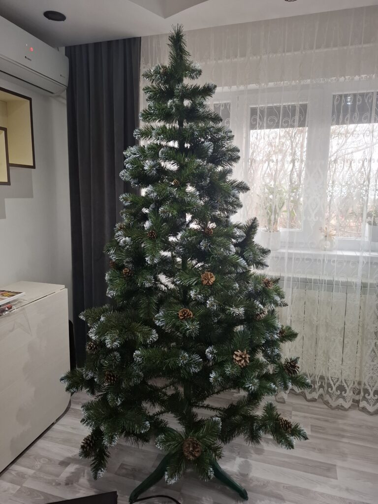 Nu am reușit să-l aranjez frumos, însă bradul e conform așteptărilor! Recomand!!! Și da într-adevăr grijă mare la conurile de la brad…. Posibil să cadă dacă sunt agățați.