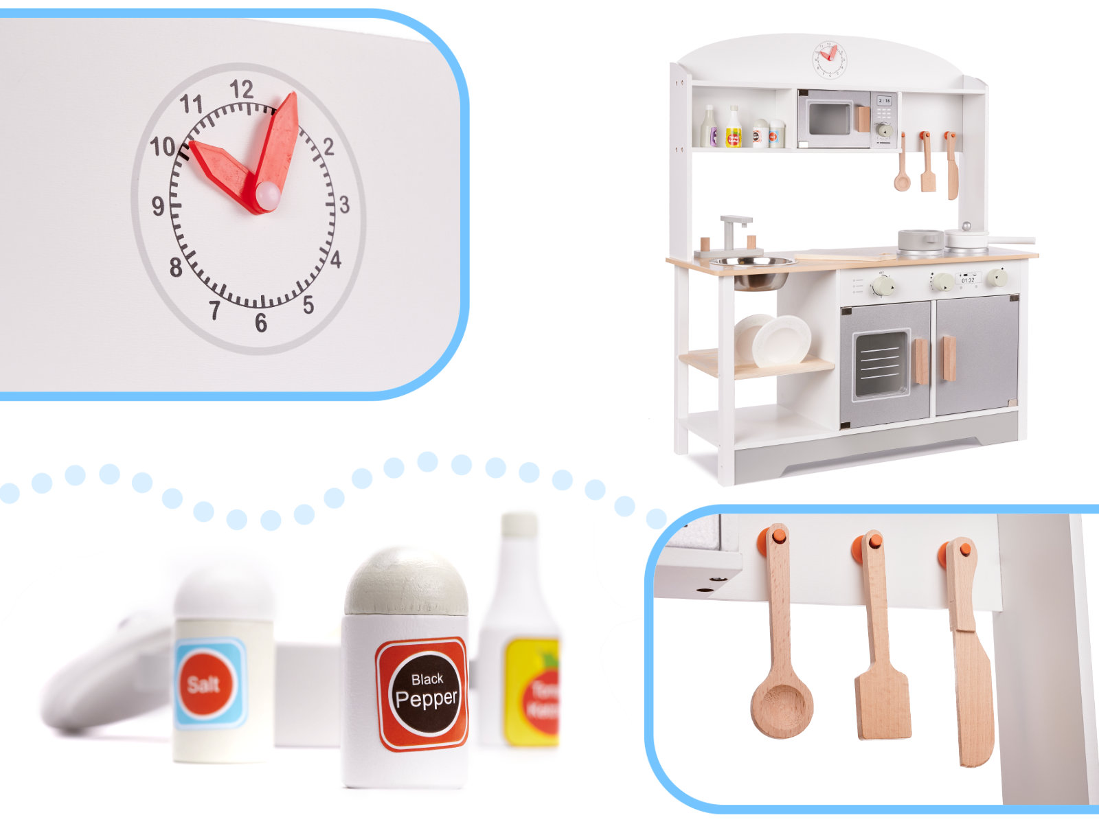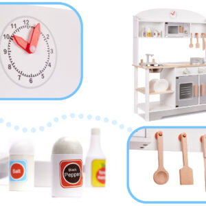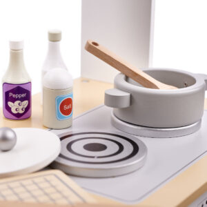 Bucataria din lemn pentru copii este un set de joaca modern, realizat din MDF si lemn, cu multiple accesorii incluse. Ofera o experienta realista, incurajand dezvoltarea imaginatiei si a abilitatilor practice ale celor mici.