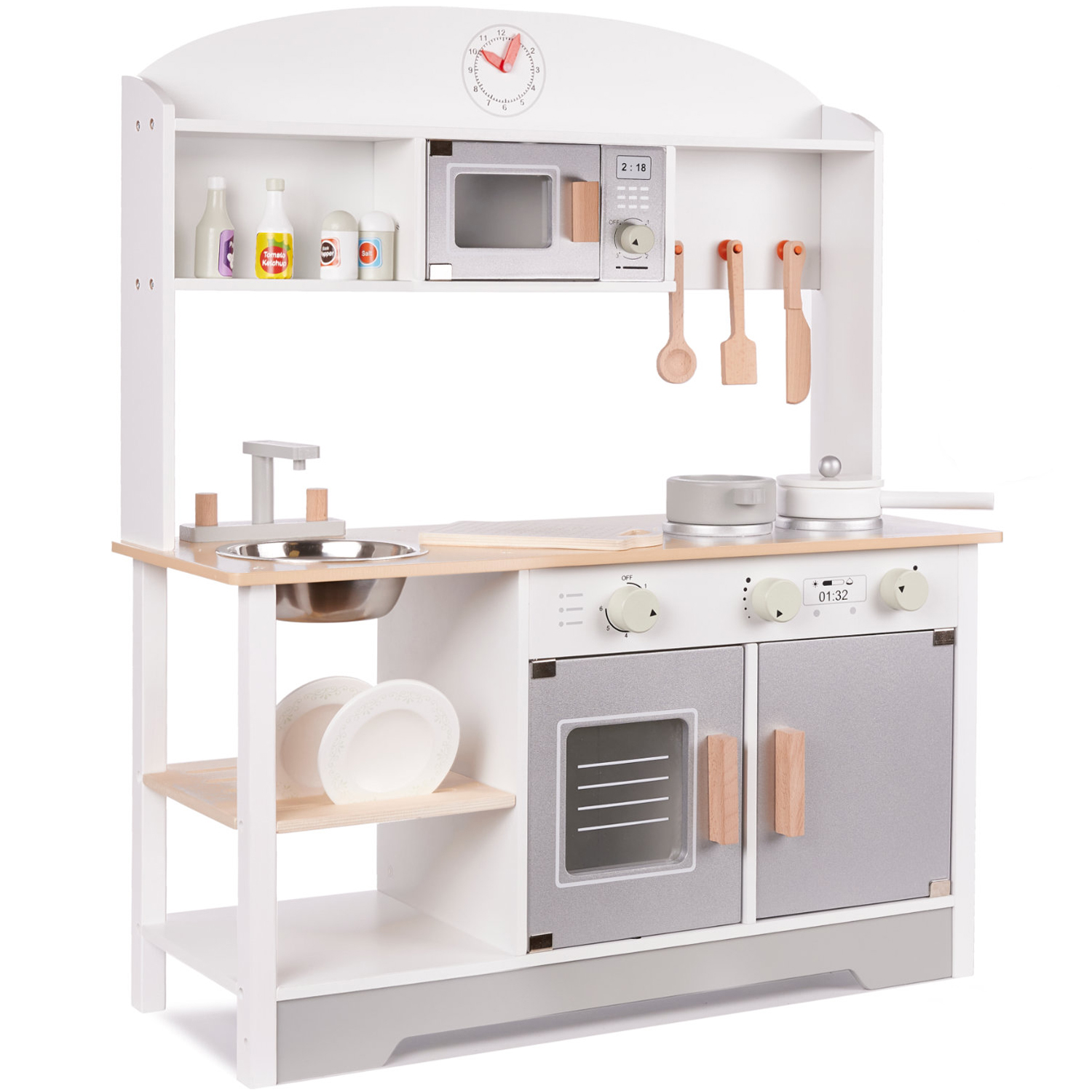 Bucatarie din lemn pentru copii cu accesorii, MDF si lemn, 68x25x82 cm, gri si alb