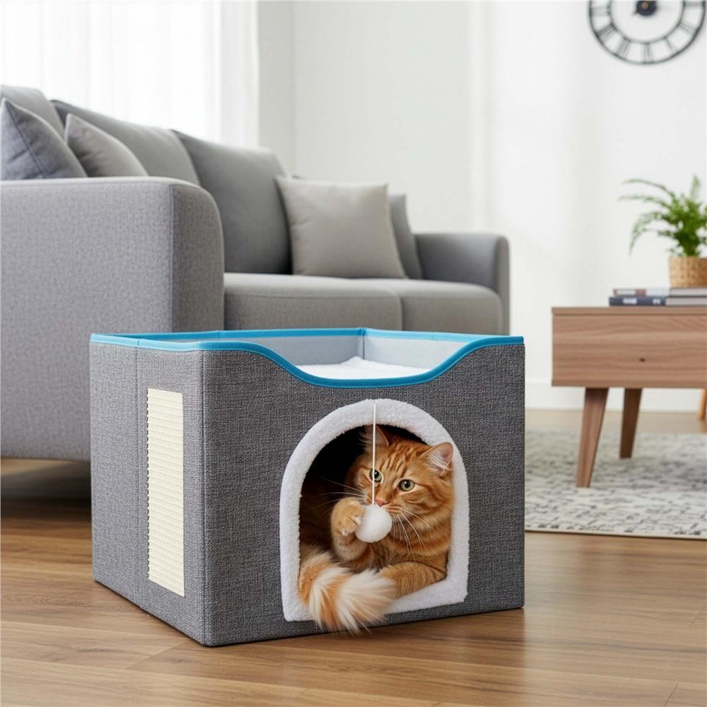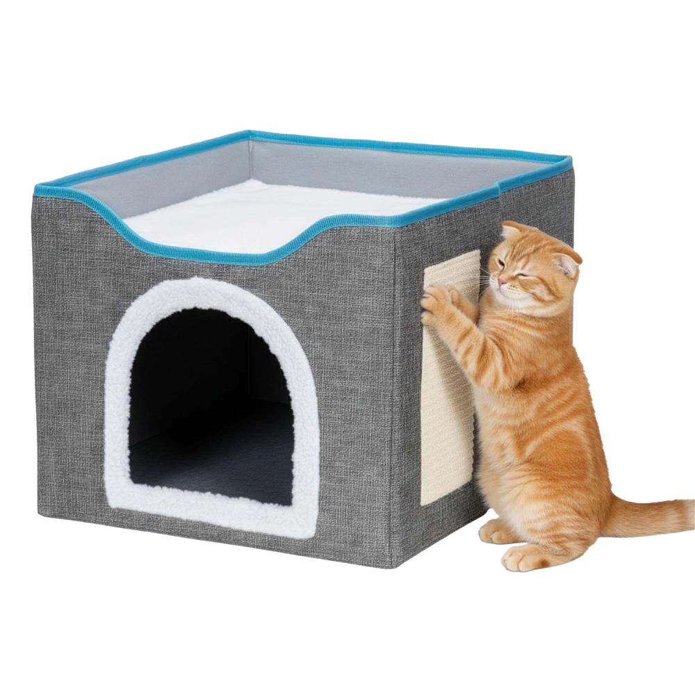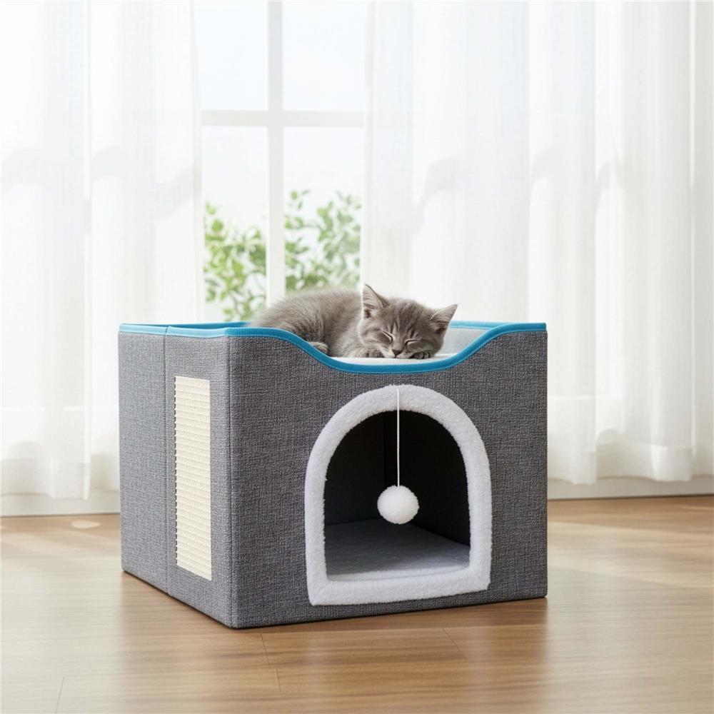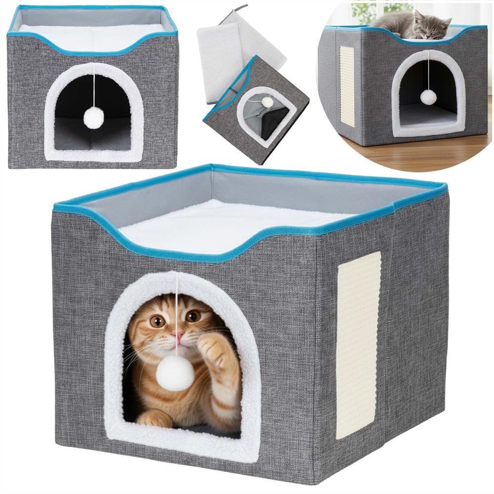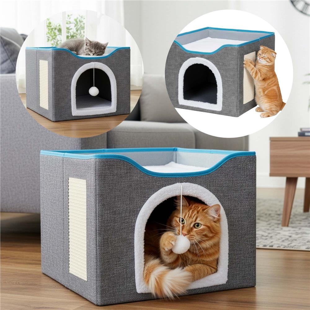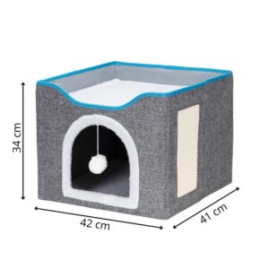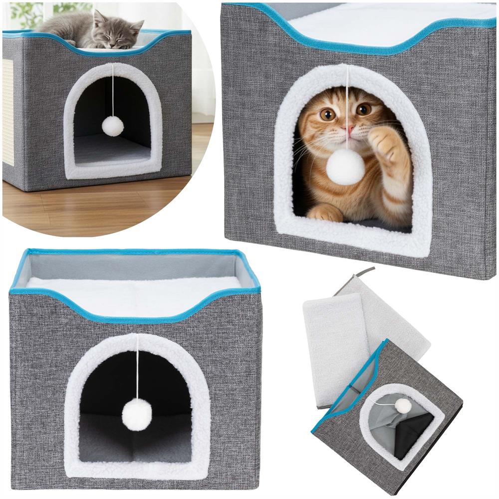 Casuta multifunctionala pentru pisici, conceputa pentru odihna, joaca si zgariat intr-un singur spatiu compact. Structura din lemn asigura stabilitate, iar elementele textile ofera confort zilnic. Platforma superioara si jucaria suspendata stimuleaza activitatea si relaxarea animalului.