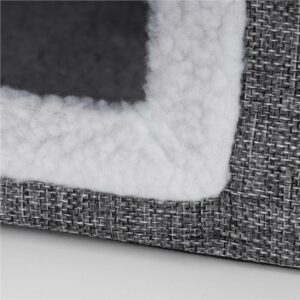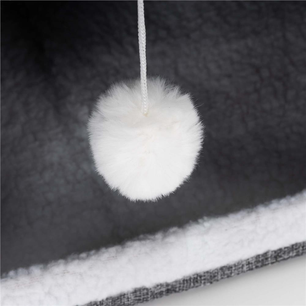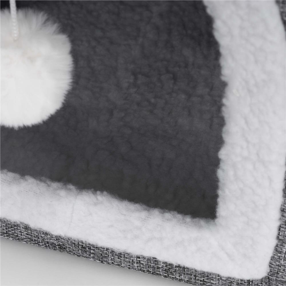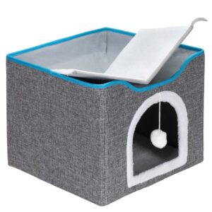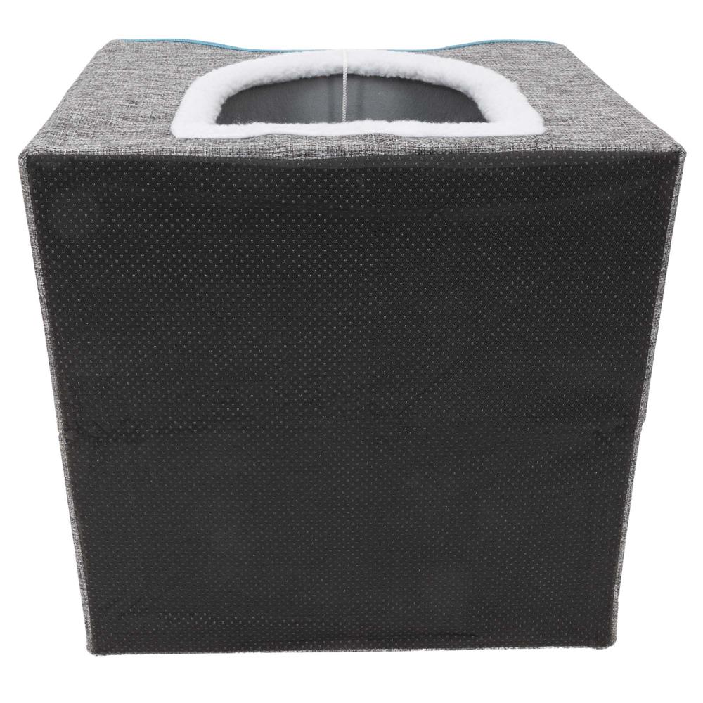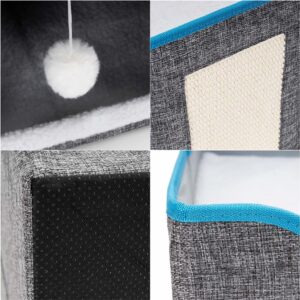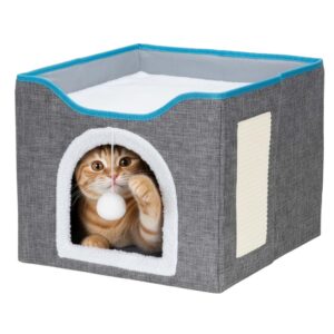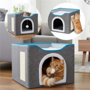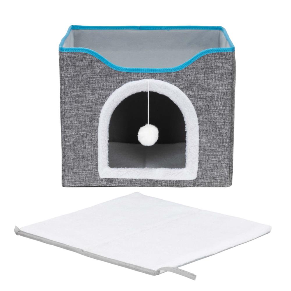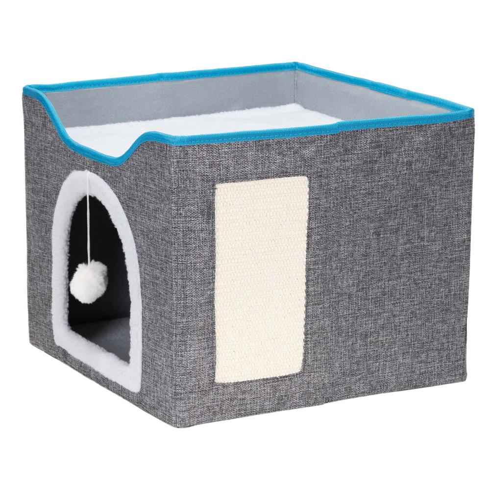 Casuta multifunctionala pentru pisici, conceputa pentru odihna, joaca si zgariat intr-un singur spatiu compact. Structura din lemn asigura stabilitate, iar elementele textile ofera confort zilnic. Platforma superioara si jucaria suspendata stimuleaza activitatea si relaxarea animalului.