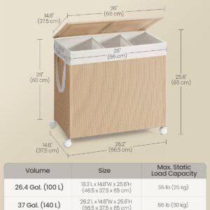 SONGMICS Cos rufe din tesatura tip ratan, 140L cu 3 compartimente si roti, 66x38x65 cm, bej natur SONGMICS Cos rufe din tesatura tip ratan, 140L cu 3 compartimente si roti, 66x38x65 cm, bej natur