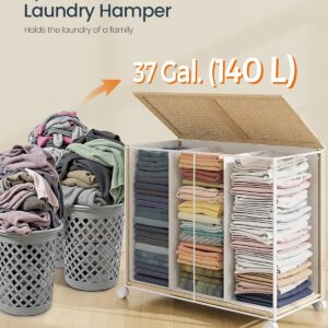 SONGMICS Cos rufe din tesatura tip ratan, 140L cu 3 compartimente si roti, 66x38x65 cm, bej natur