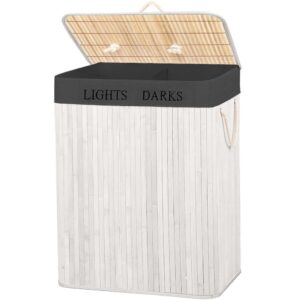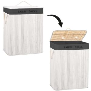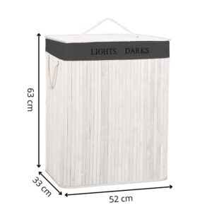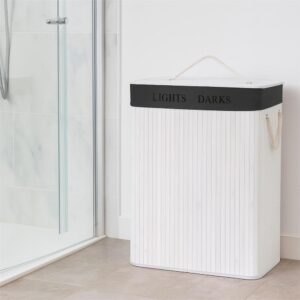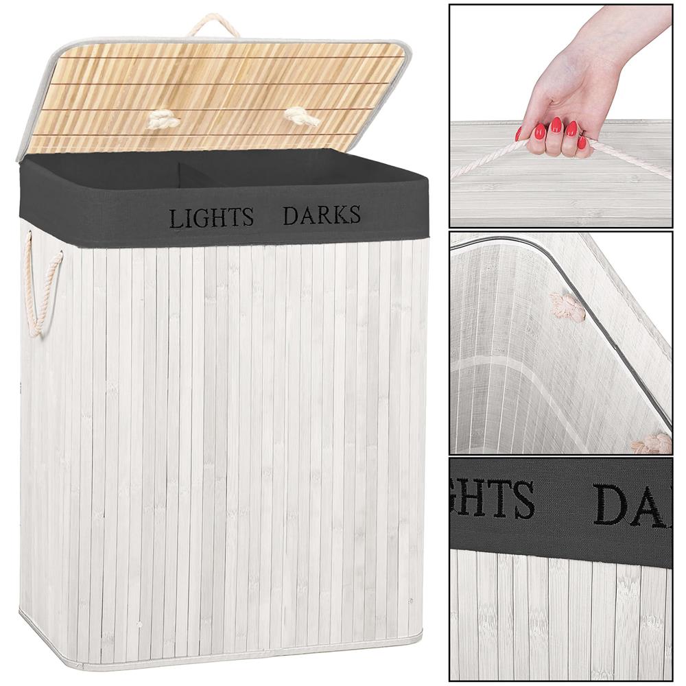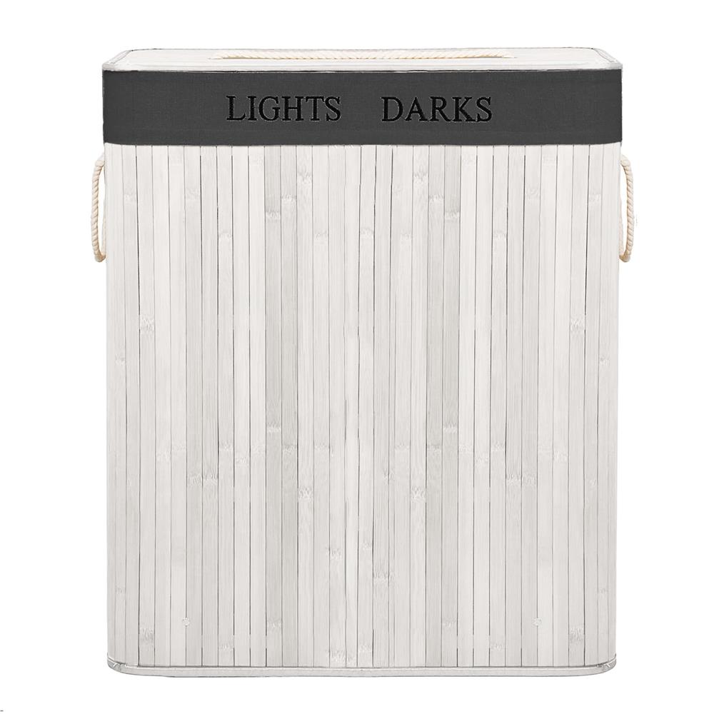 Cos pentru rufe cu doua compartimente, realizat din structura rigida din bambus si MDF, prevazut cu sac textil detasabil de culoare gri inchis. Permite sortarea eficienta a rufelor si mentine un aspect ordonat in baie, dormitor sau dressing.