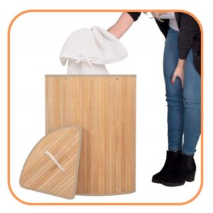 Cosul de rufe triunghiular este conceput pentru a fi amplasat in coltul camerei, economisind spatiu in baie sau spalatorie. Structura din bambus ofera stabilitate si un aspect natural, iar sacul textil interior permite depozitarea practica a rufelor. Capacul prevazut cu maner din sfoara ascunde continutul si pastreaza aspectul ordonat al incaperii.