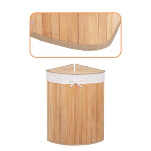 Cos de rufe triunghiular pentru colt cu capac, bambus si sac textil detasabil, 60 litri, 55x35x60 cm, maro natur