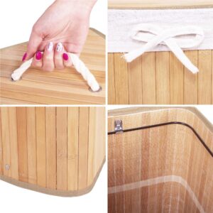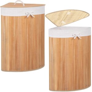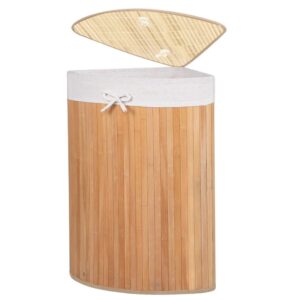Cos de rufe triunghiular pentru colt cu capac, bambus si sac textil detasabil, 60 litri, 55x35x60 cm, maro natur Cos de rufe triunghiular pentru colt cu capac, bambus si sac textil detasabil, 60 litri, 55x35x60 cm, maro natur
