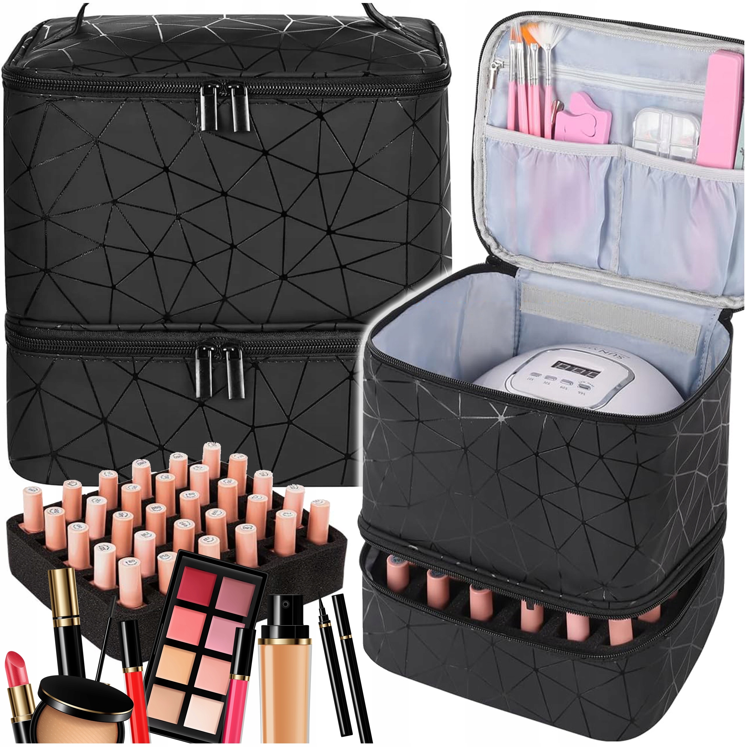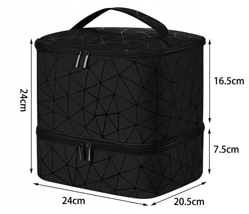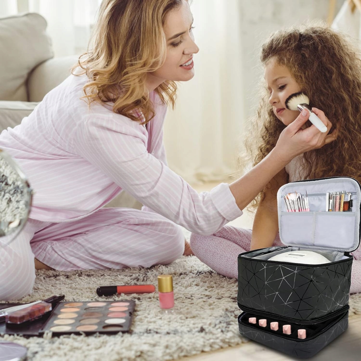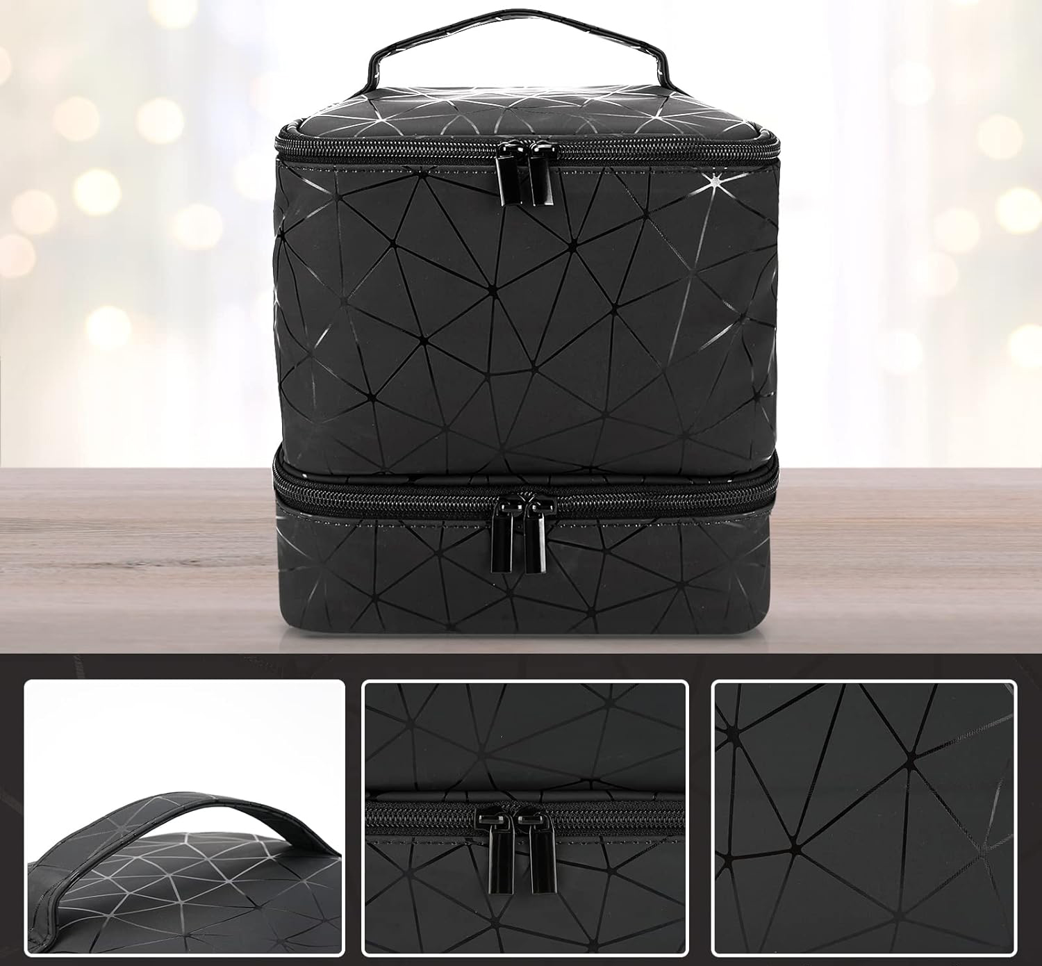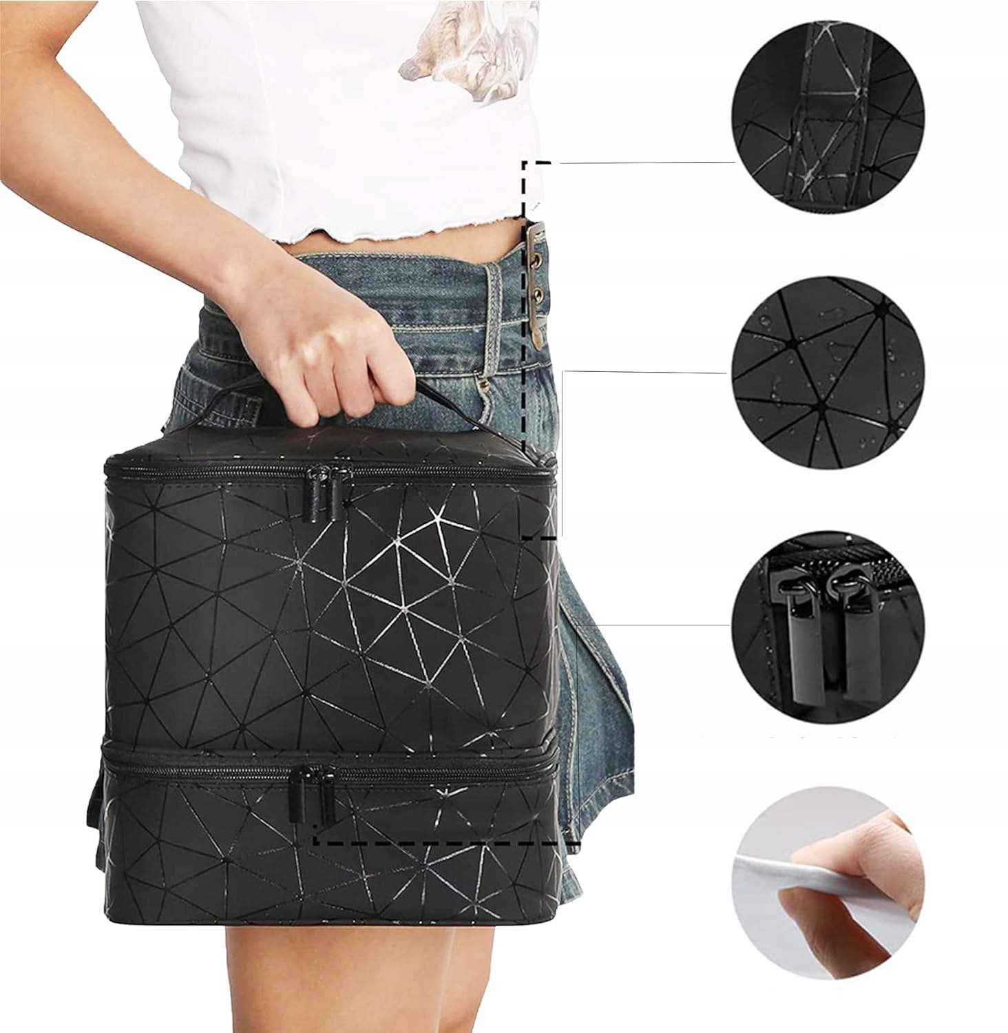 Organizator pentru cosmetice, practic cu doua compartimente, buzunare multiple si grila din burete pentru depozitarea in siguranta a produselor cosmetice si accesoriilor.