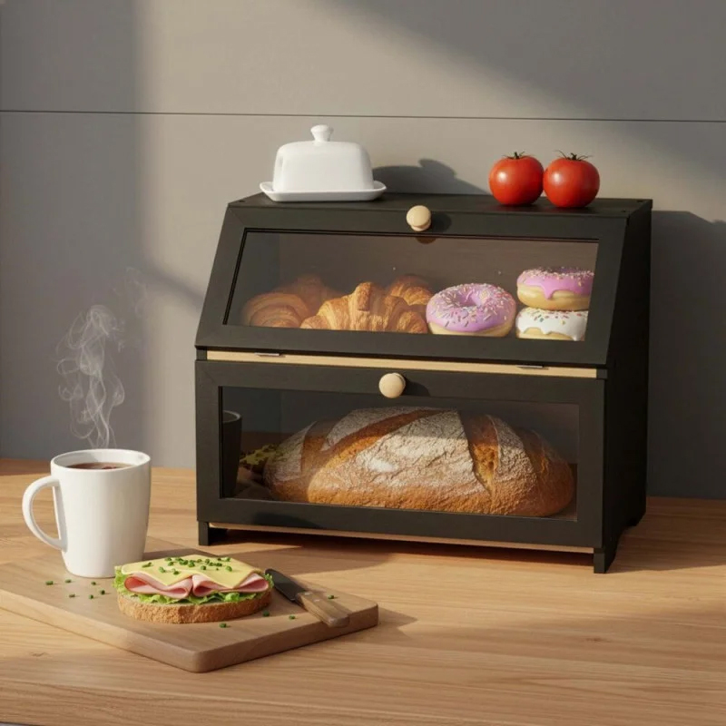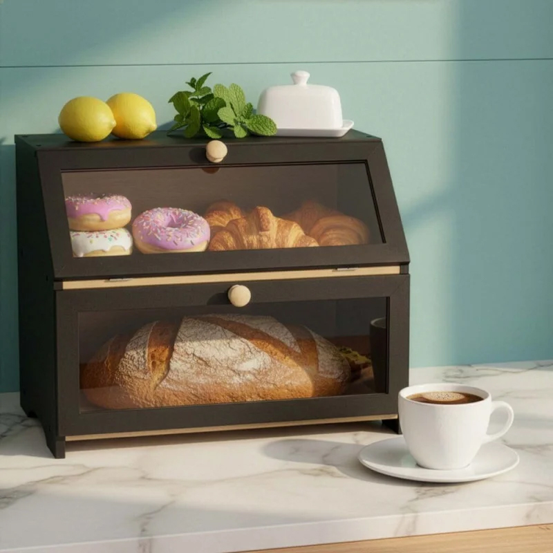 Cutia pentru paine cu doua niveluri ofera o solutie practica si eleganta pentru depozitarea painii si a produselor de panificatie. Constructia din bambus ajuta la mentinerea prospetimii, iar ferestrele acrilice transparente permit verificarea continutului fara deschidere. Designul modern se integreaza usor in orice bucatarie.