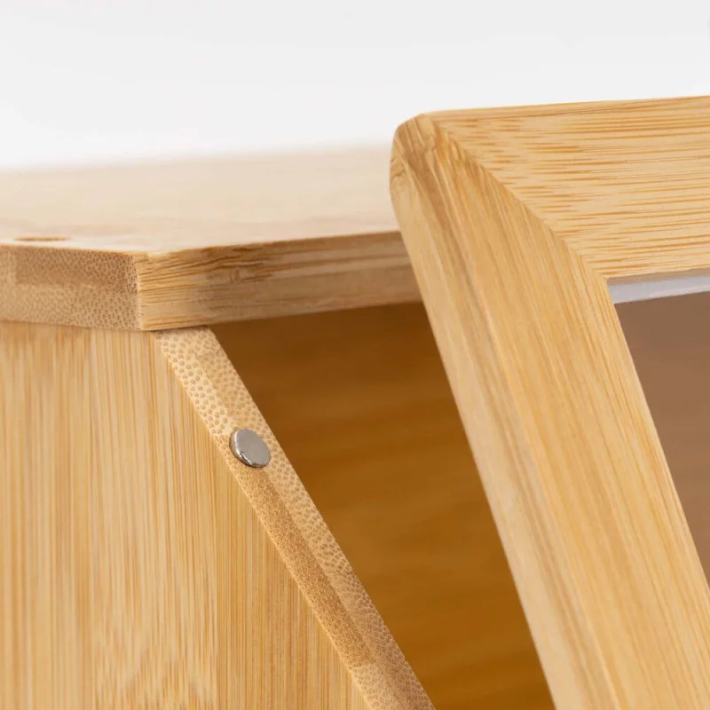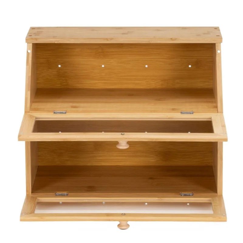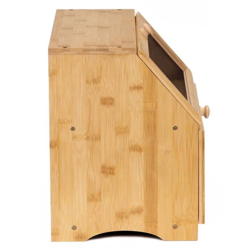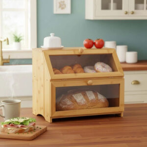 Cutia pentru paine cu doua niveluri permite depozitarea organizata a painii si a produselor de panificatie, contribuind la mentinerea prospetimii acestora pentru mai mult timp. Constructia din bambus este potrivita pentru contactul cu alimentele, iar ferestrele acrilice transparente permit verificarea continutului fara deschidere. Designul natural se potriveste usor in orice bucatarie.