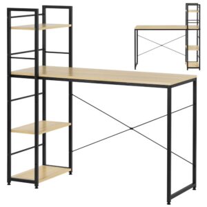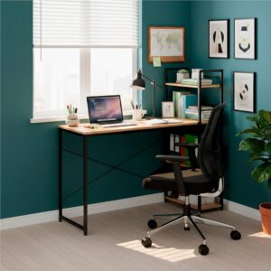 Etajera de birou ofera trei rafturi functionale si un blat spatios, ideale pentru depozitare si organizare. Combinatia de metal si MDF asigura rigiditate si durabilitate, iar picioarele reglabile permit stabilizarea pe orice suprafata.