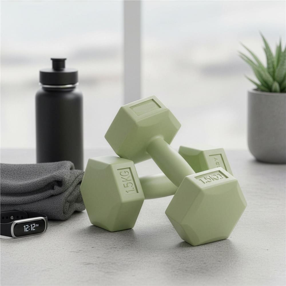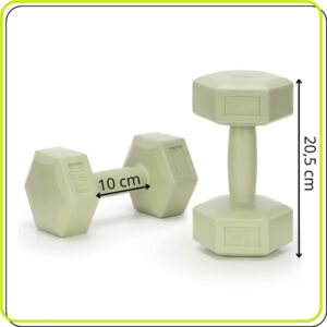 Set de gantere hexagonale, potrivite pentru antrenamente de tonifiere si cresterea rezistentei musculare. Forma hex previne rostogolirea pe sol, iar suprafata din PP este durabila si usor de intretinut. Greutatea de 1,5 kg per bucata este ideala pentru exercitii progresive acasa sau la sala.
