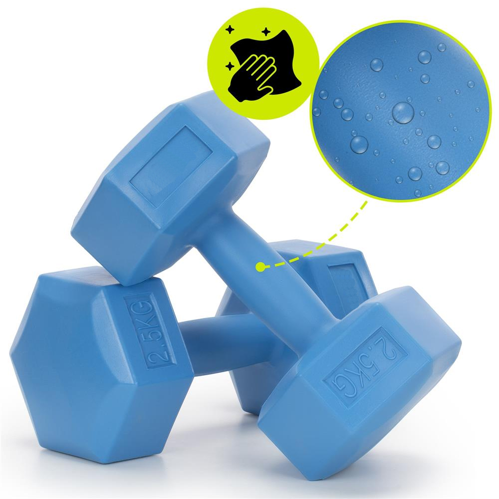 Set de gantere hexagonale, potrivite pentru antrenamente de forta si tonifiere progresiva. Forma hexagonala previne rostogolirea pe sol, oferind stabilitate sporita in timpul exercitiilor. Suprafata din PP este rezistenta si usor de intretinut, iar greutatea de 2,5 kg per bucata este ideala pentru exercitii de intensitate medie.