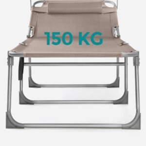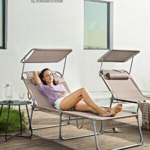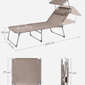 SONGMICS Sezlong pliabil, cu parasolar si tetiera, spatar reglabil in 4 pozitii, maxim 150kg, 200x71x38 cm, taupe SONGMICS Sezlong pliabil, cu parasolar si tetiera, spatar reglabil in 4 pozitii, maxim 150kg, 200x71x38 cm, taupe