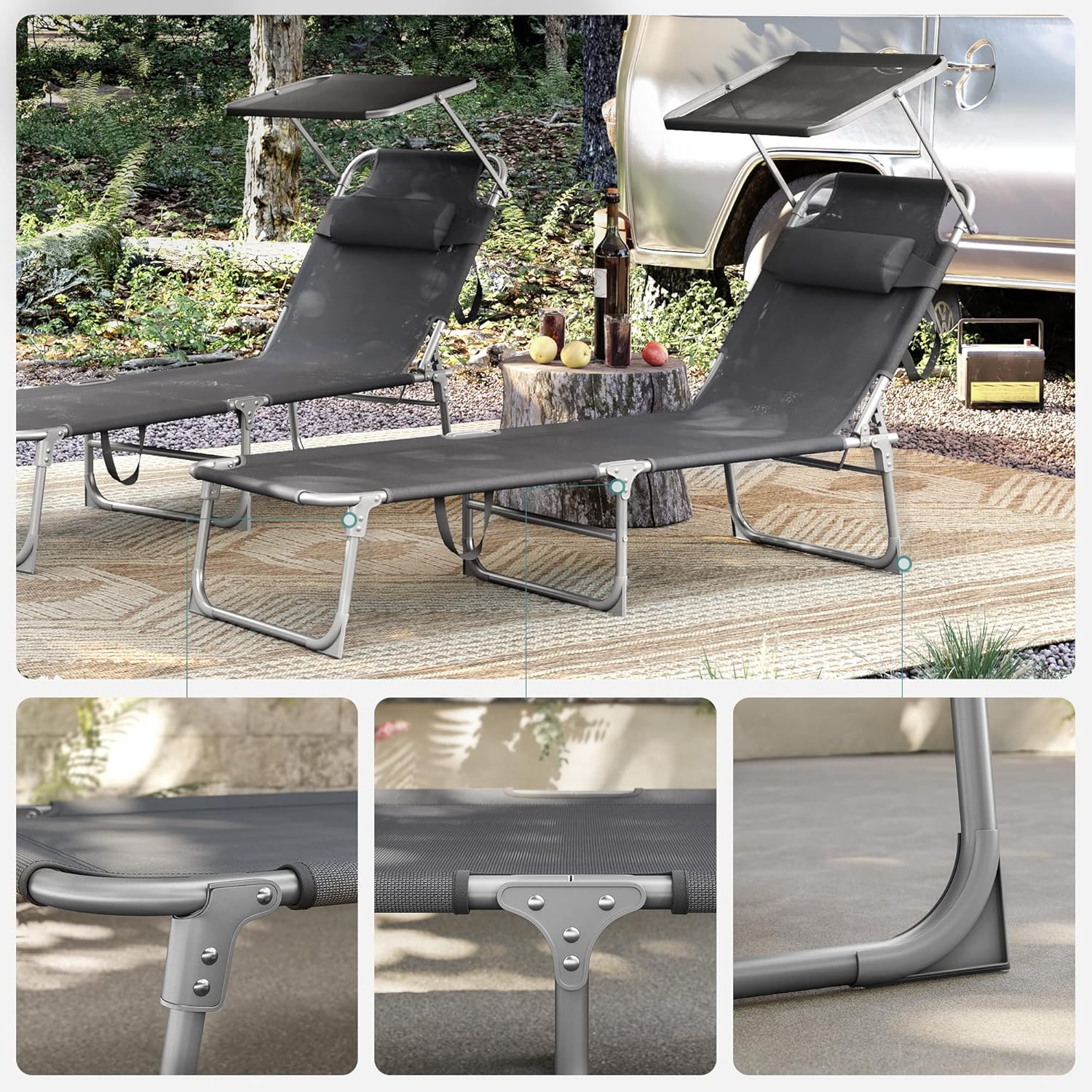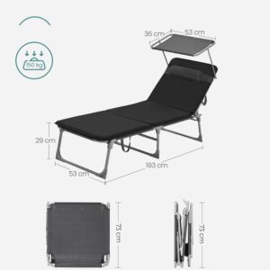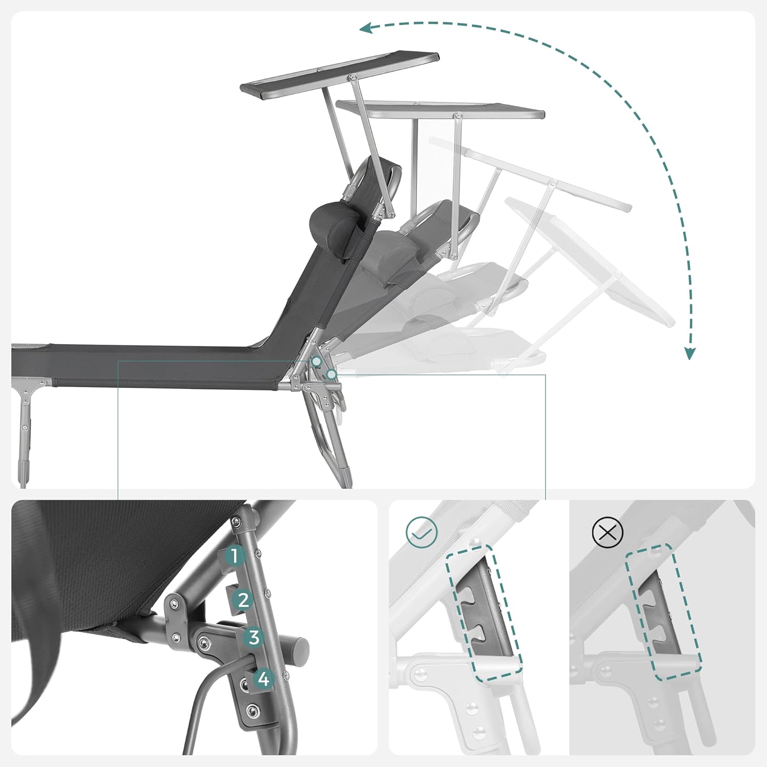 Sezlongul pliabil SONGMICS este ideal pentru zilele relaxante petrecute la soare. Usor de transportat si depozitat, acesta iti ofera confort datorita spatarului reglabil si materialului respirabil. Parasolarul integrat iti permite sa te bucuri de soare fara disconfort, fie ca esti la piscina, pe terasa sau in gradina.