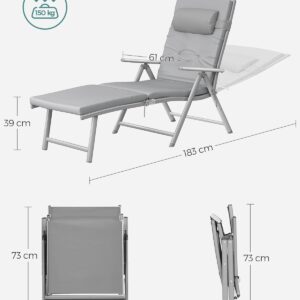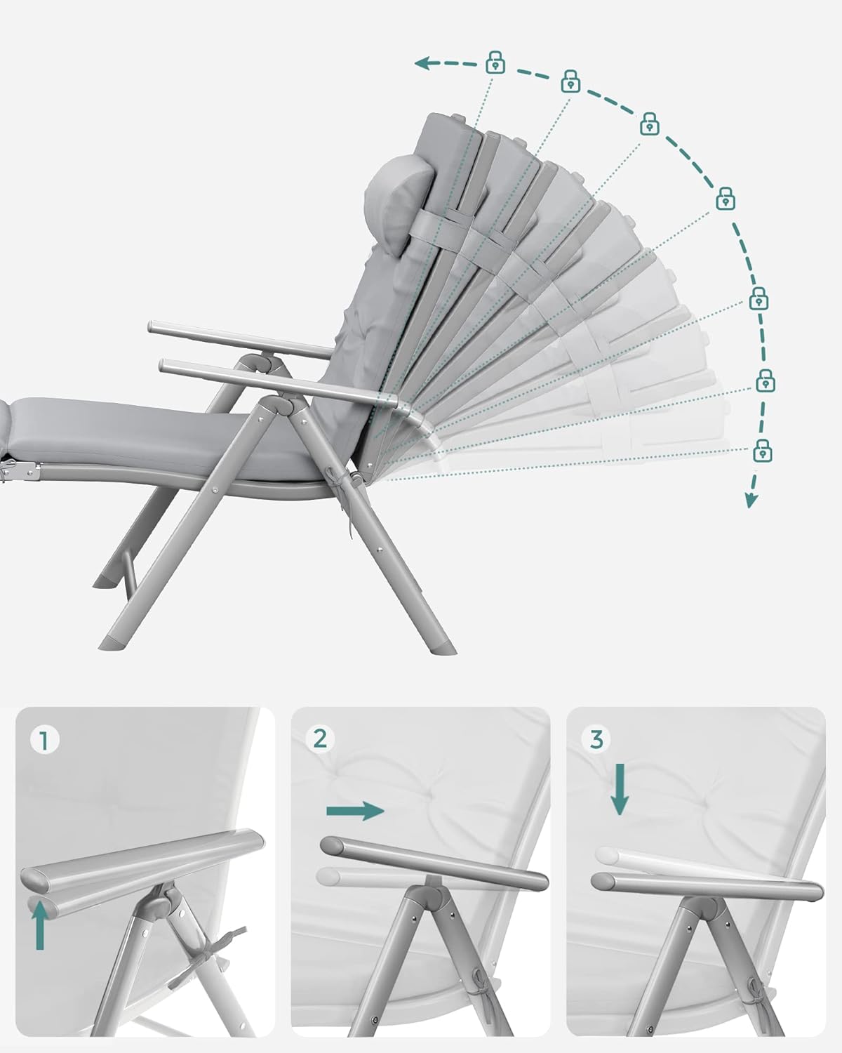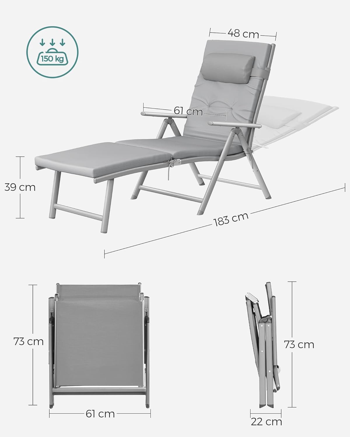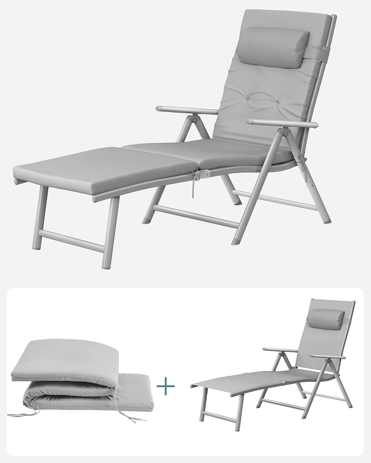 Sezlongul pliabil SONGMICS ofera un nivel superior de confort datorita saltelei groase de 6 cm si spatarului reglabil in 7 pozitii. Structura din aluminiu rezistent la rugina il face ideal pentru utilizare in exterior, iar designul pliabil il face usor de depozitat si transportat.