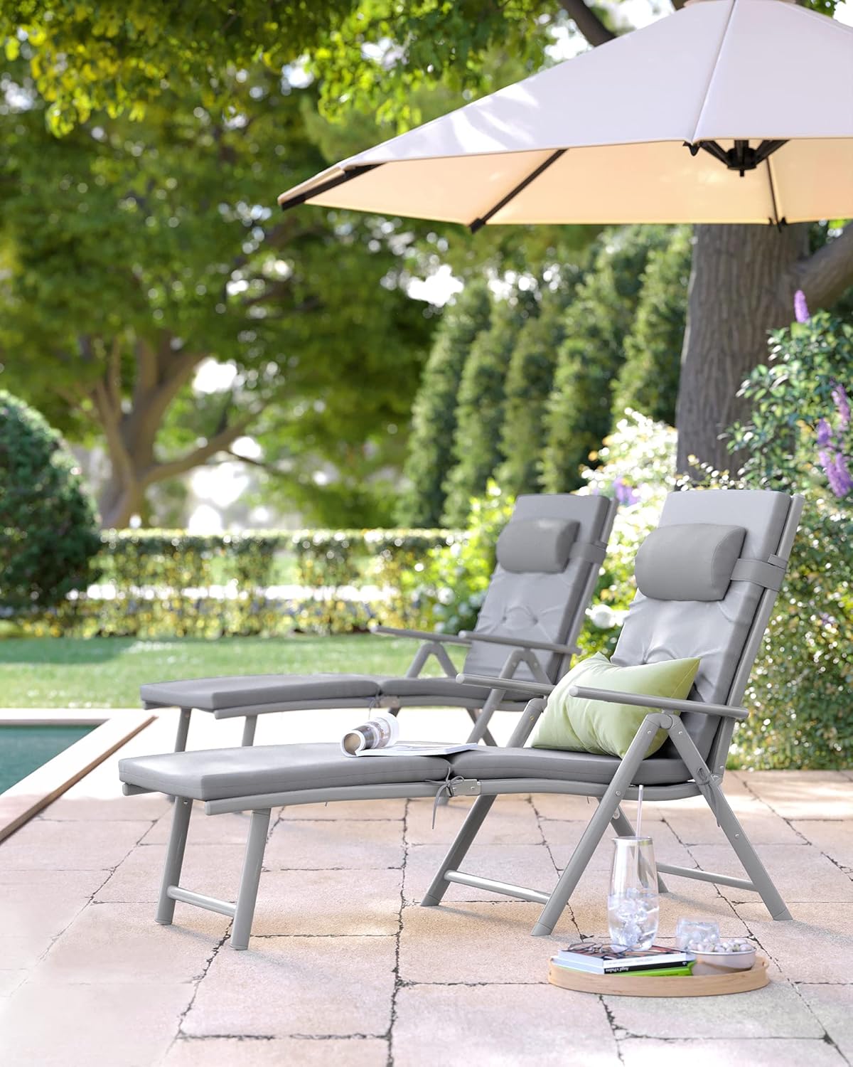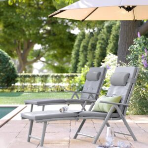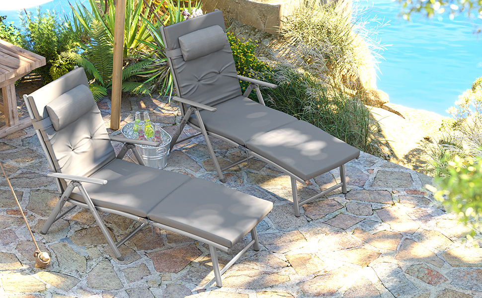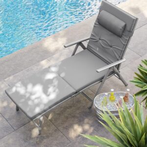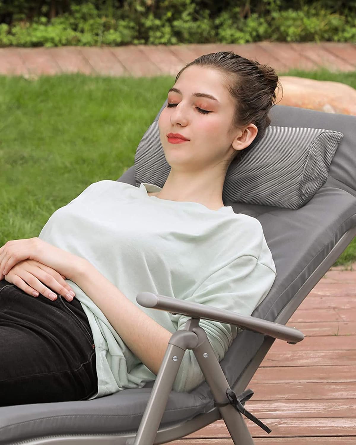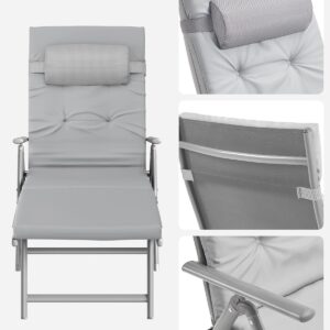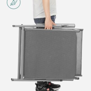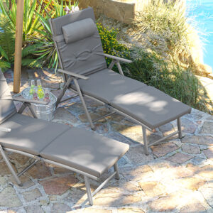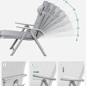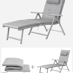 Sezlongul pliabil SONGMICS ofera un nivel superior de confort datorita saltelei groase de 6 cm si spatarului reglabil in 7 pozitii. Structura din aluminiu rezistent la rugina il face ideal pentru utilizare in exterior, iar designul pliabil il face usor de depozitat si transportat.