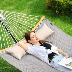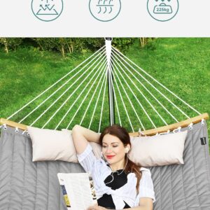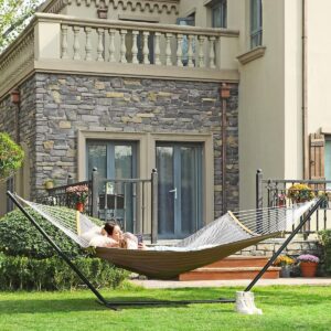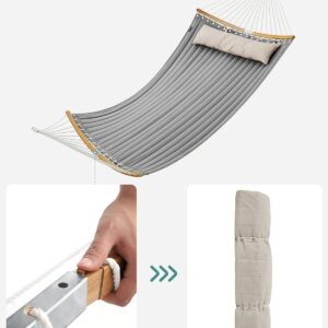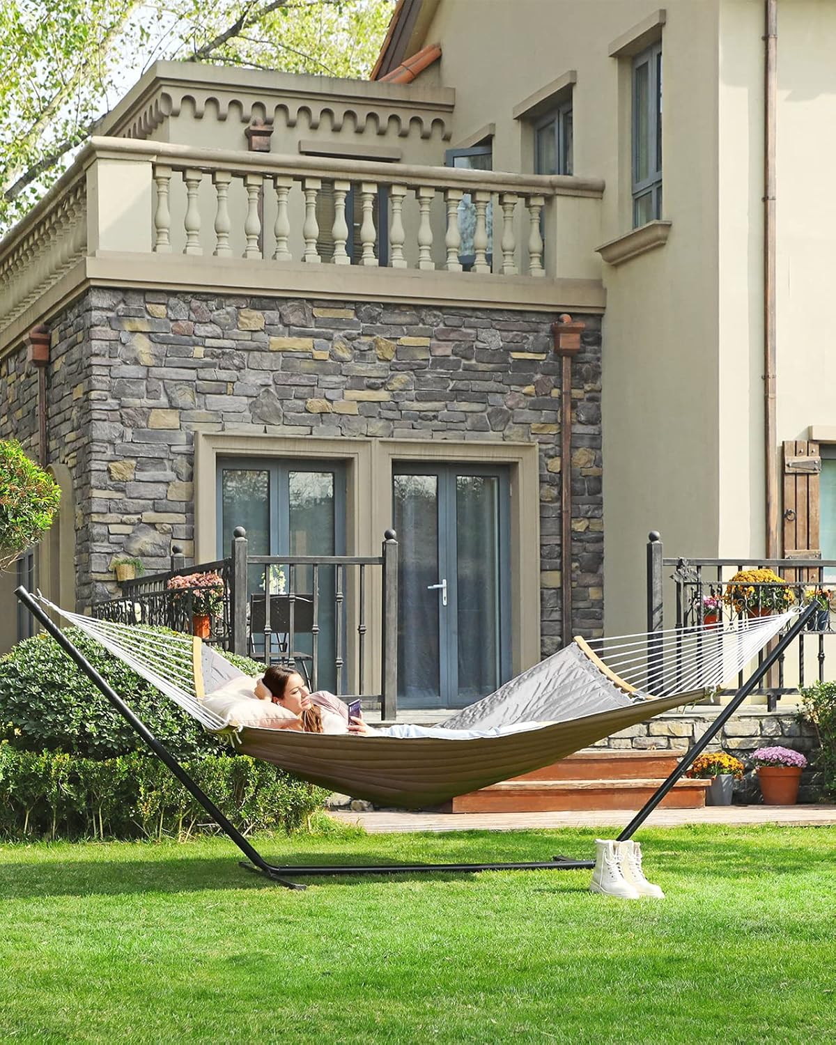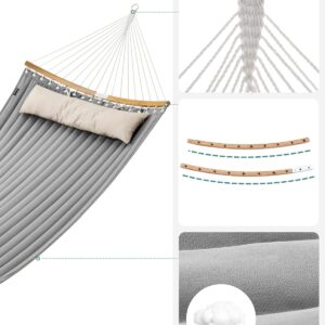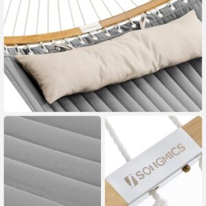 Hamacul dublu SONGMICS in combinatie gri si bej este ideal pentru relaxare in aer liber, oferind stabilitate si confort datorita barelor curbate din bambus. Suprafata generoasa si materialul captusit creeaza un spatiu perfect pentru odihna, fie singur, fie alaturi de o persoana draga.