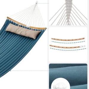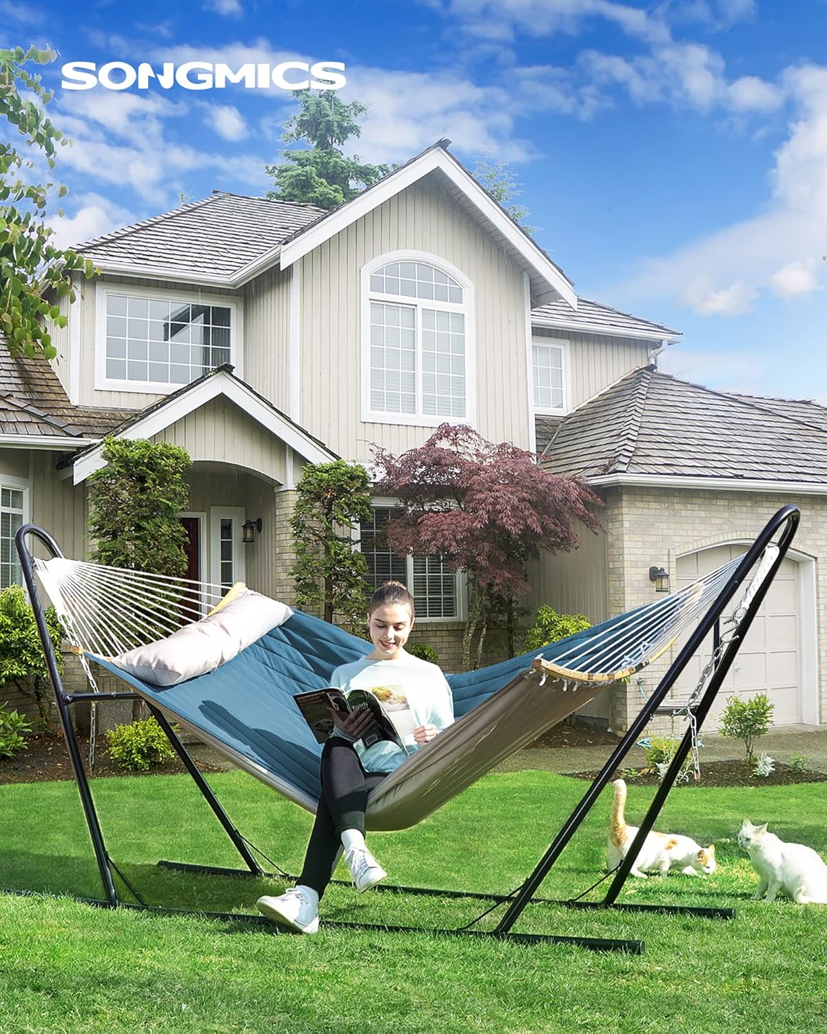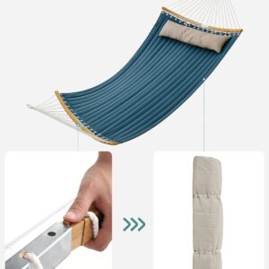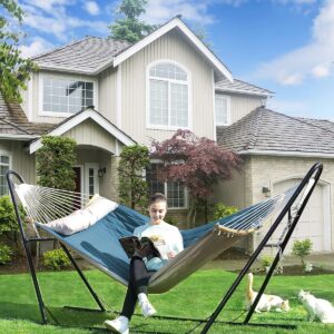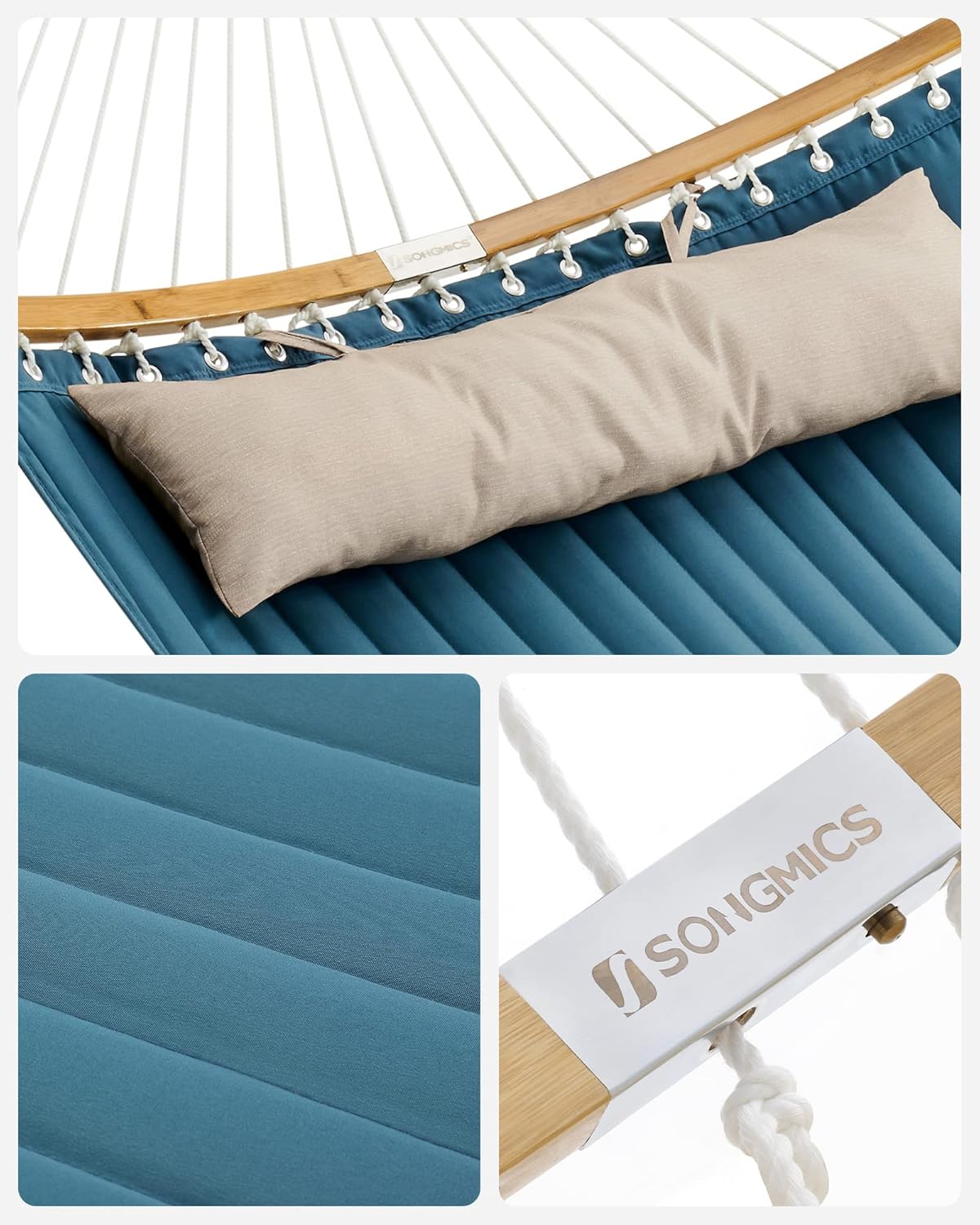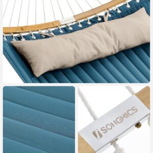 Hamacul dublu SONGMICS in combinatie albastru si bej ofera confort si stabilitate pentru momentele de relaxare in aer liber. Designul cu bare curbate din bambus reduce riscul de rasturnare, iar materialul gros captusit asigura o experienta placuta pentru una sau doua persoane.
