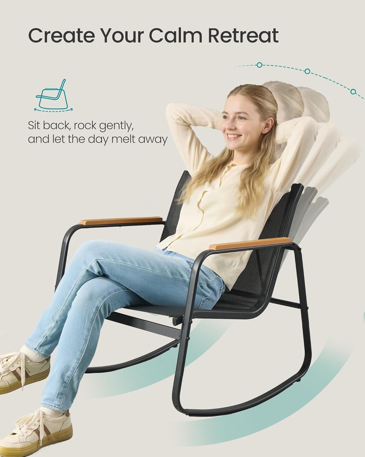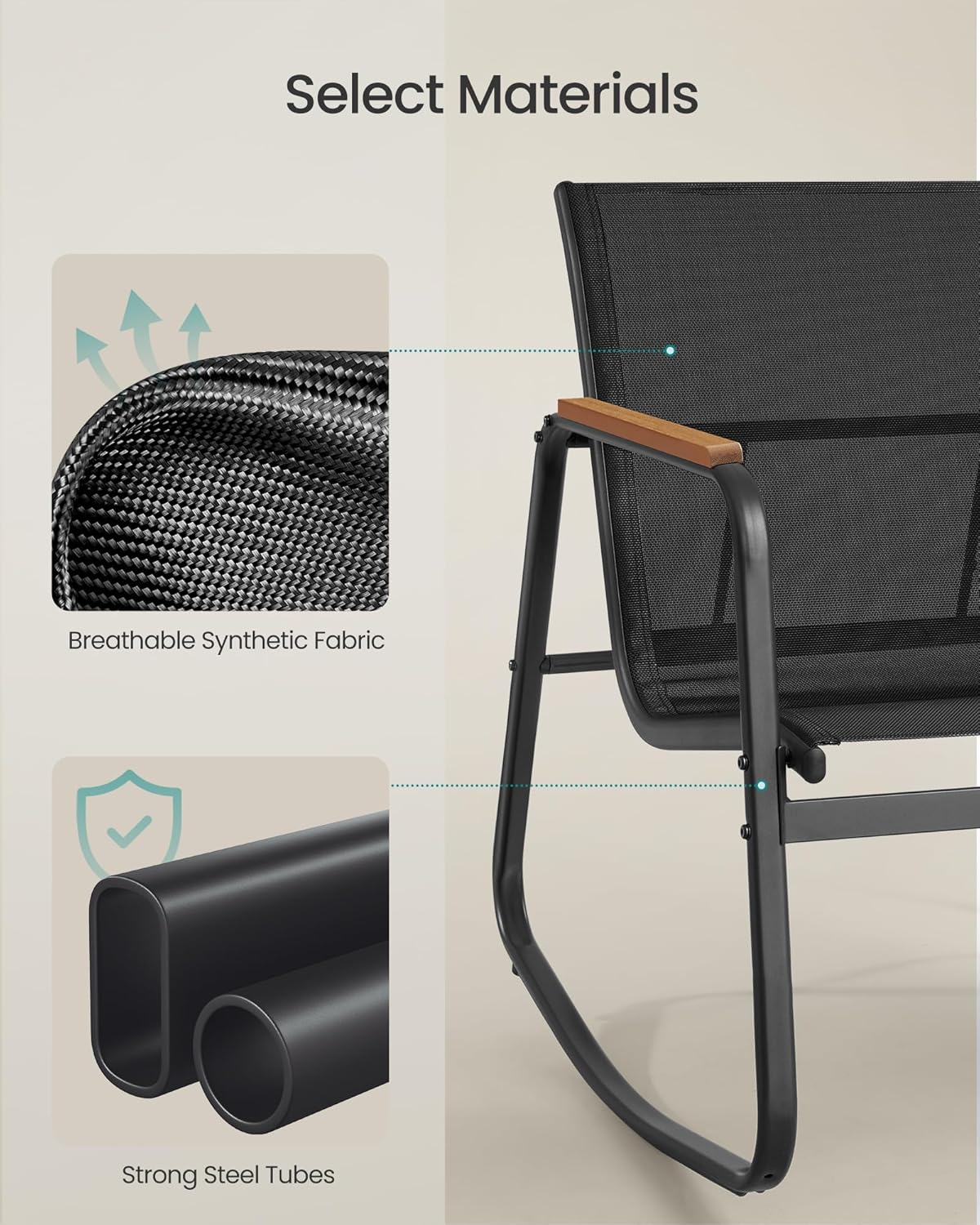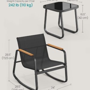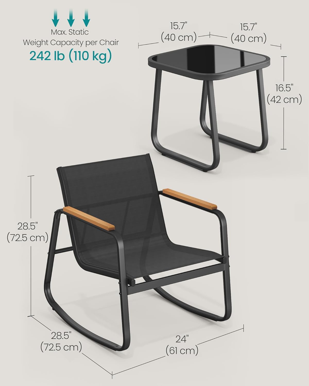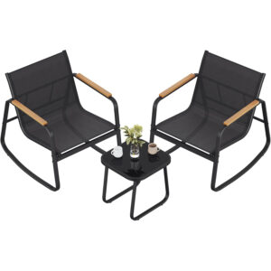 Setul de mobilier pentru gradina SONGMICS este ideal pentru relaxare in aer liber, oferind confort si stabilitate. Cele doua scaune cu functie de balans creeaza o atmosfera placuta, iar masa compacta este perfecta pentru bauturi sau accesorii. Designul modern se potriveste perfect pe terasa, balcon sau in gradina.