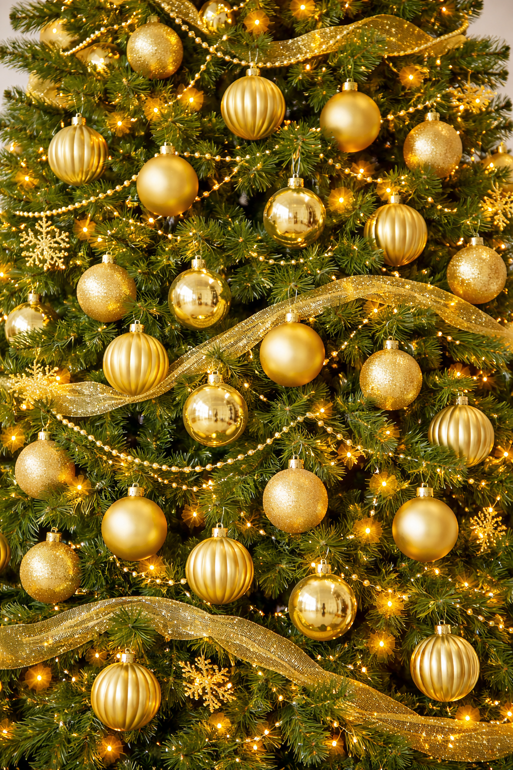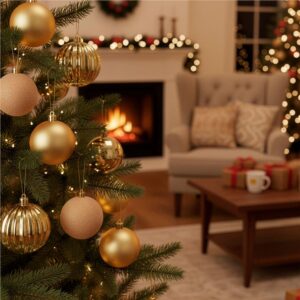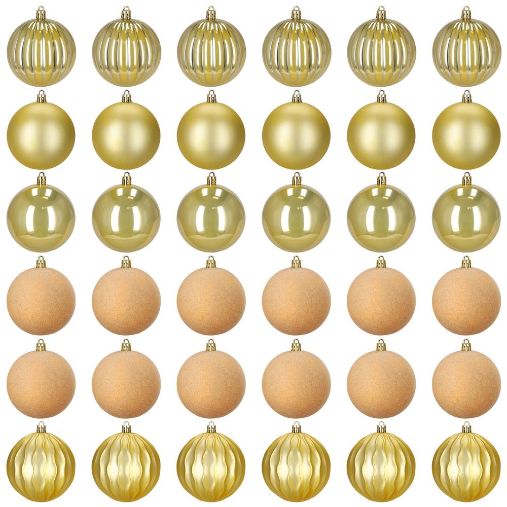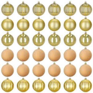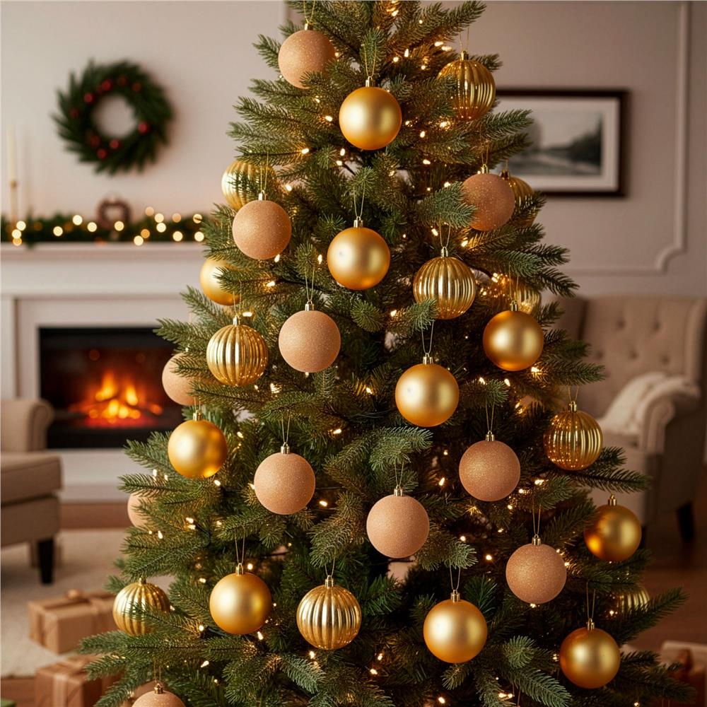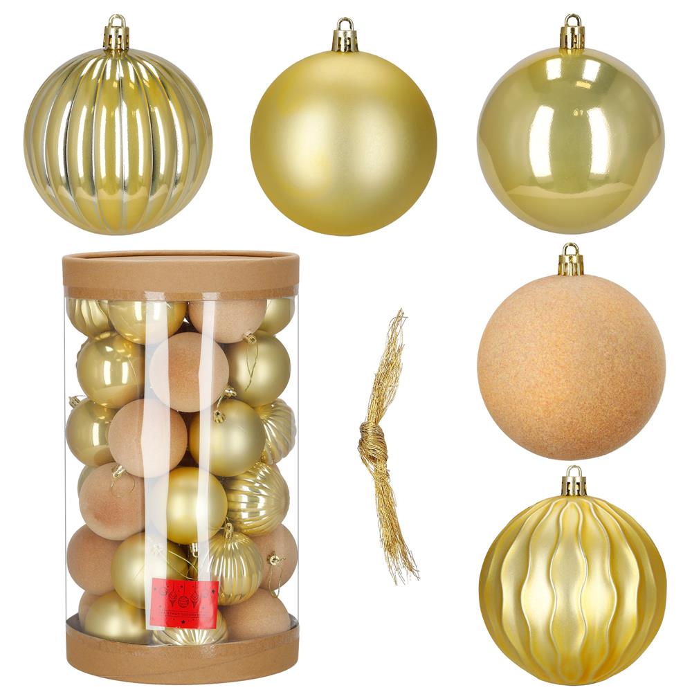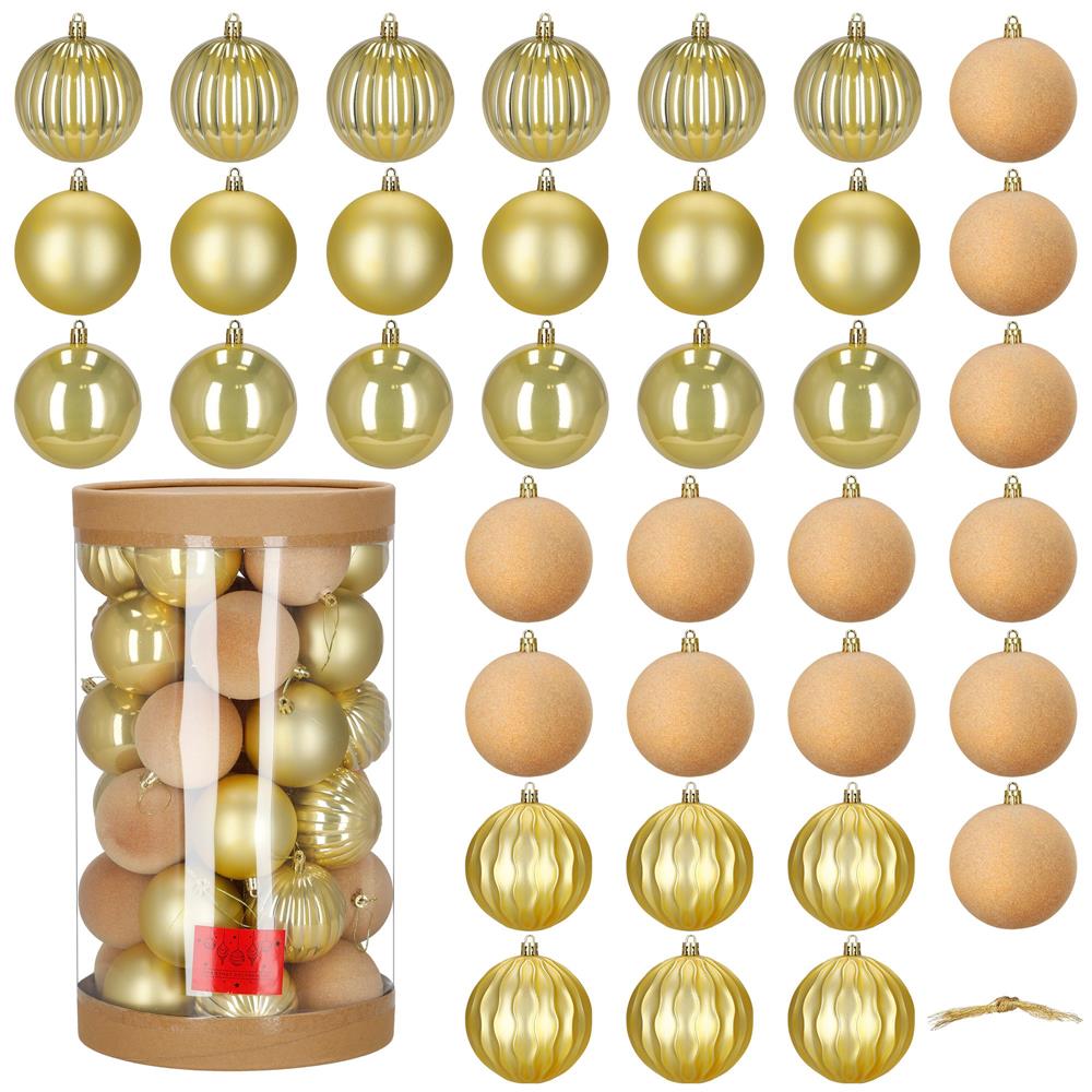 Set format din 36 globuri decorative din plastic rezistent, in nuante elegante de auriu si ecru. Globurile includ finisaje variate – lucios, semimat, catifelat si spiralat – oferind un aspect bogat si armonios pentru decorul de sarbatori. Sunt durabile si sigure, ideale pentru brad, coronite sau aranjamente festive.