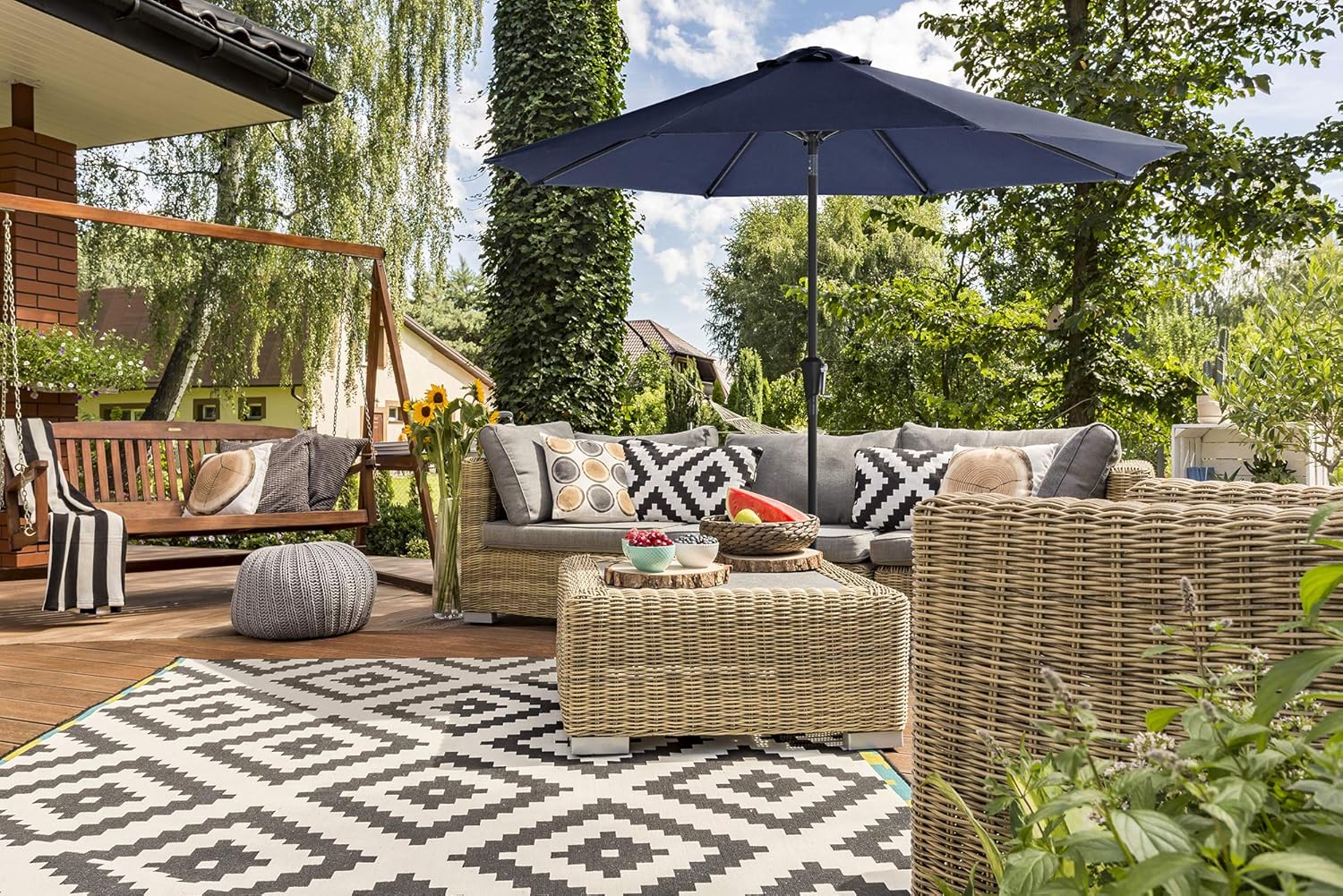 Aceasta umbrela de gradina iti ofera umbra generoasa si protectie eficienta impotriva razelor UV in zilele toride. Designul solid si materialele rezistente o fac ideala pentru relaxare in aer liber, fie in gradina, pe terasa sau balcon.